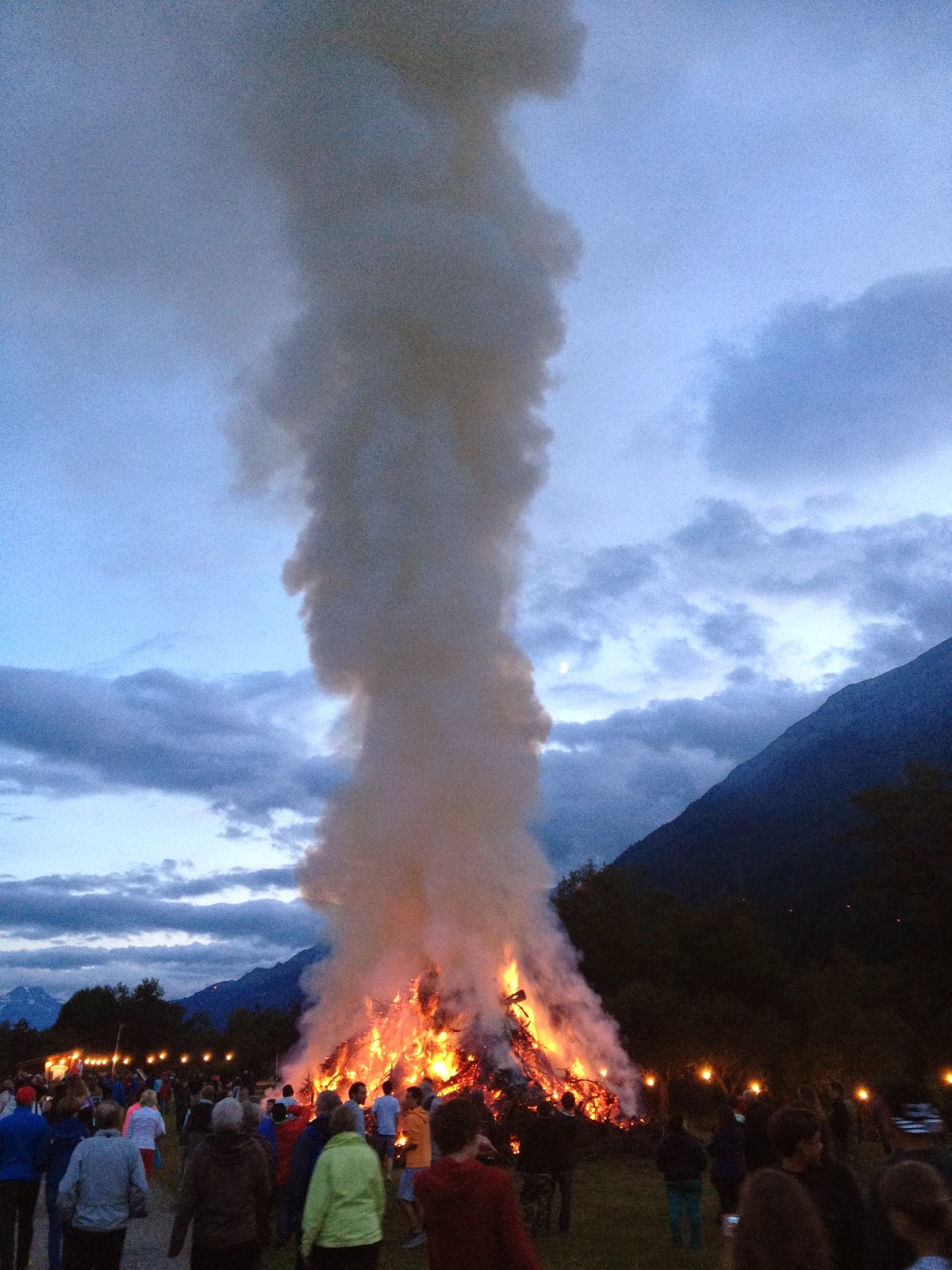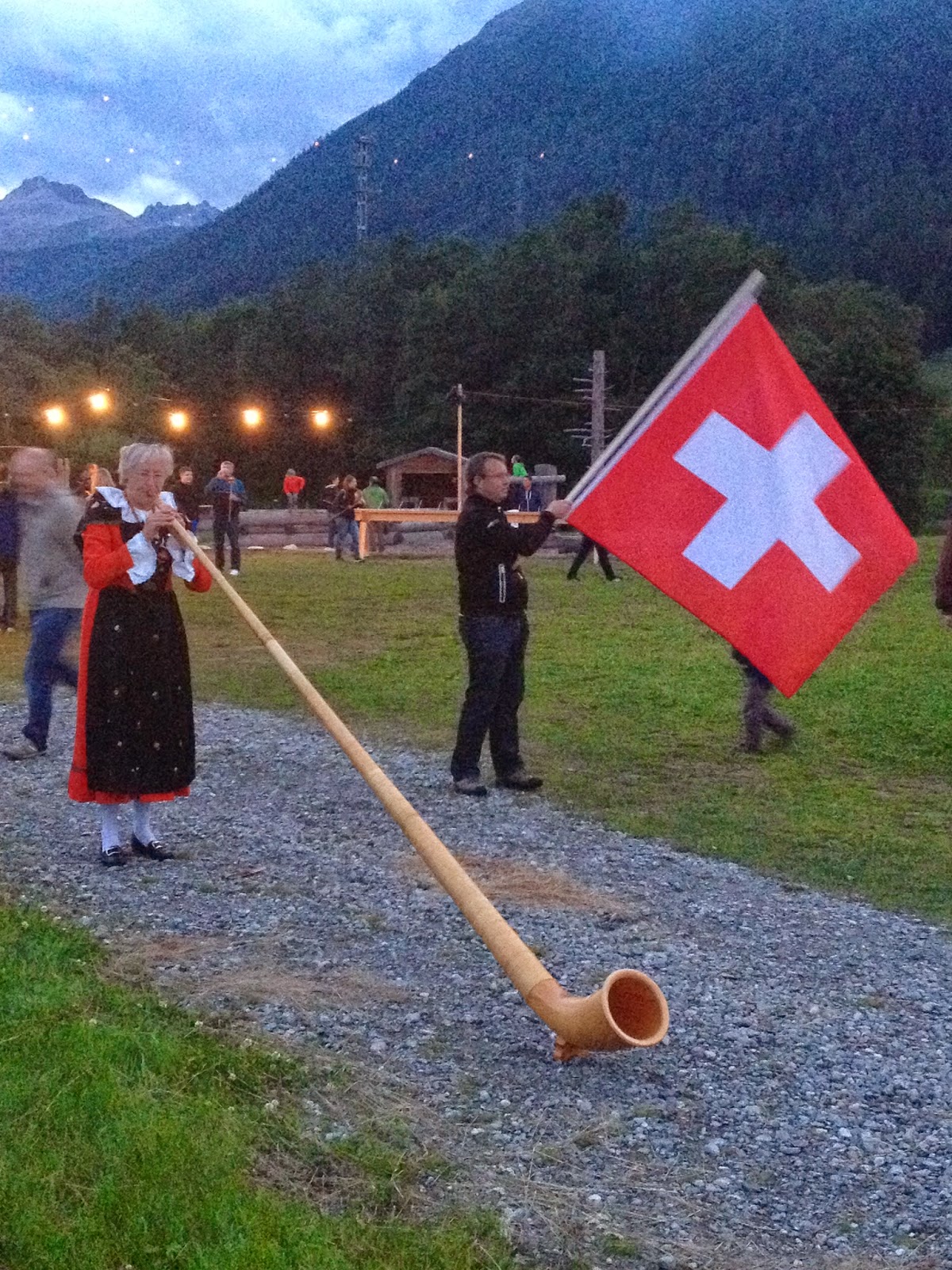 This evening has seen plenty of Alpenhorn action, flag waving and singing of the National Anthem, but the real excitement has been the fireworks! No health and safety crew needed here! As well as getting a very impressive fire blazing in the valley, the patriotic crowds all turned up with their own fireworks! That’s right, young and old spent a riotous few hours letting off bangers, rockets, flares and other such incendiary devices in true amateur style ! Carnage! Amazingly, no-one seemed remotely bothered as rockets whistled by at alarmingly low angles!