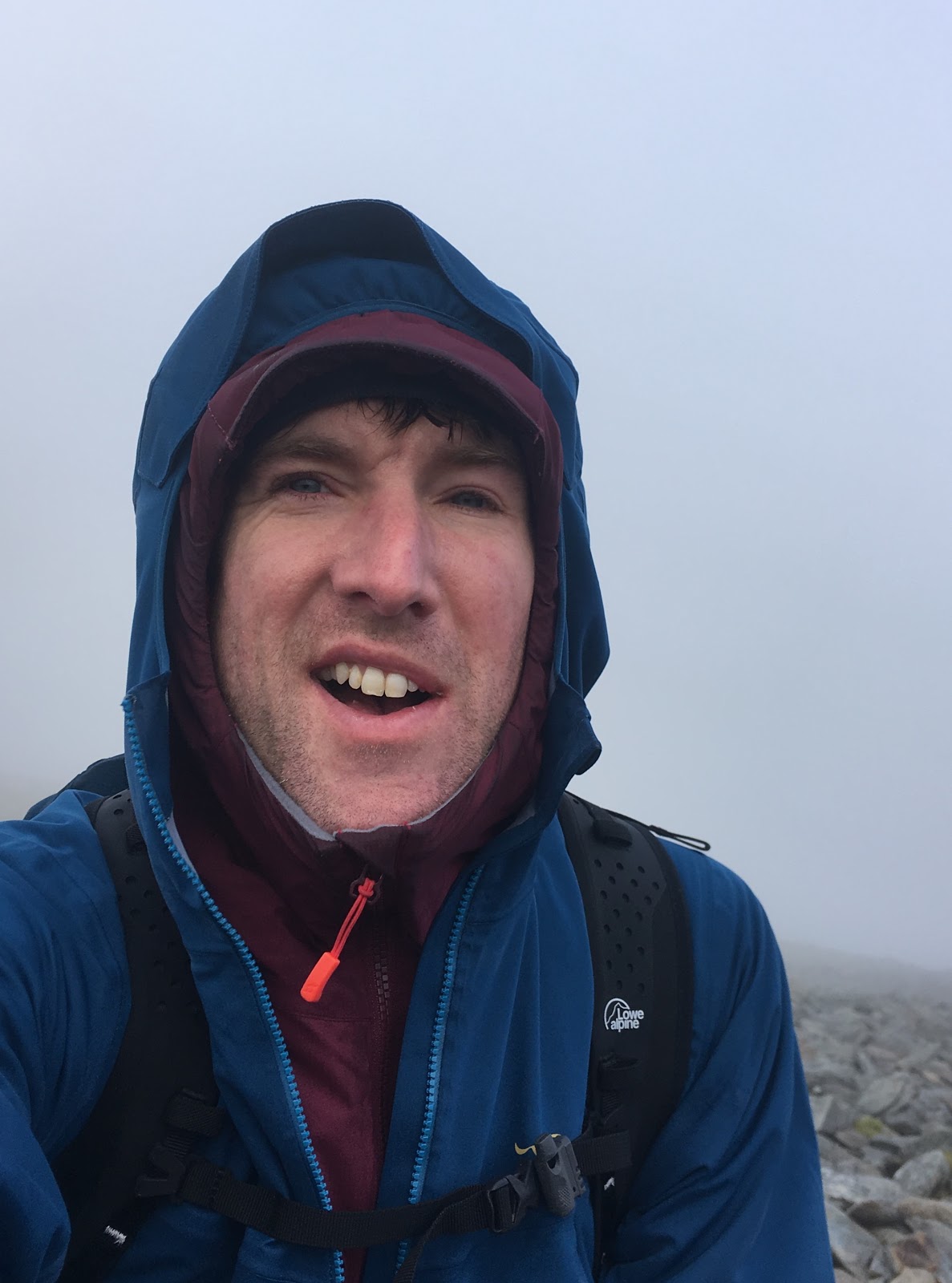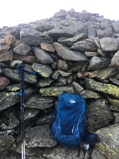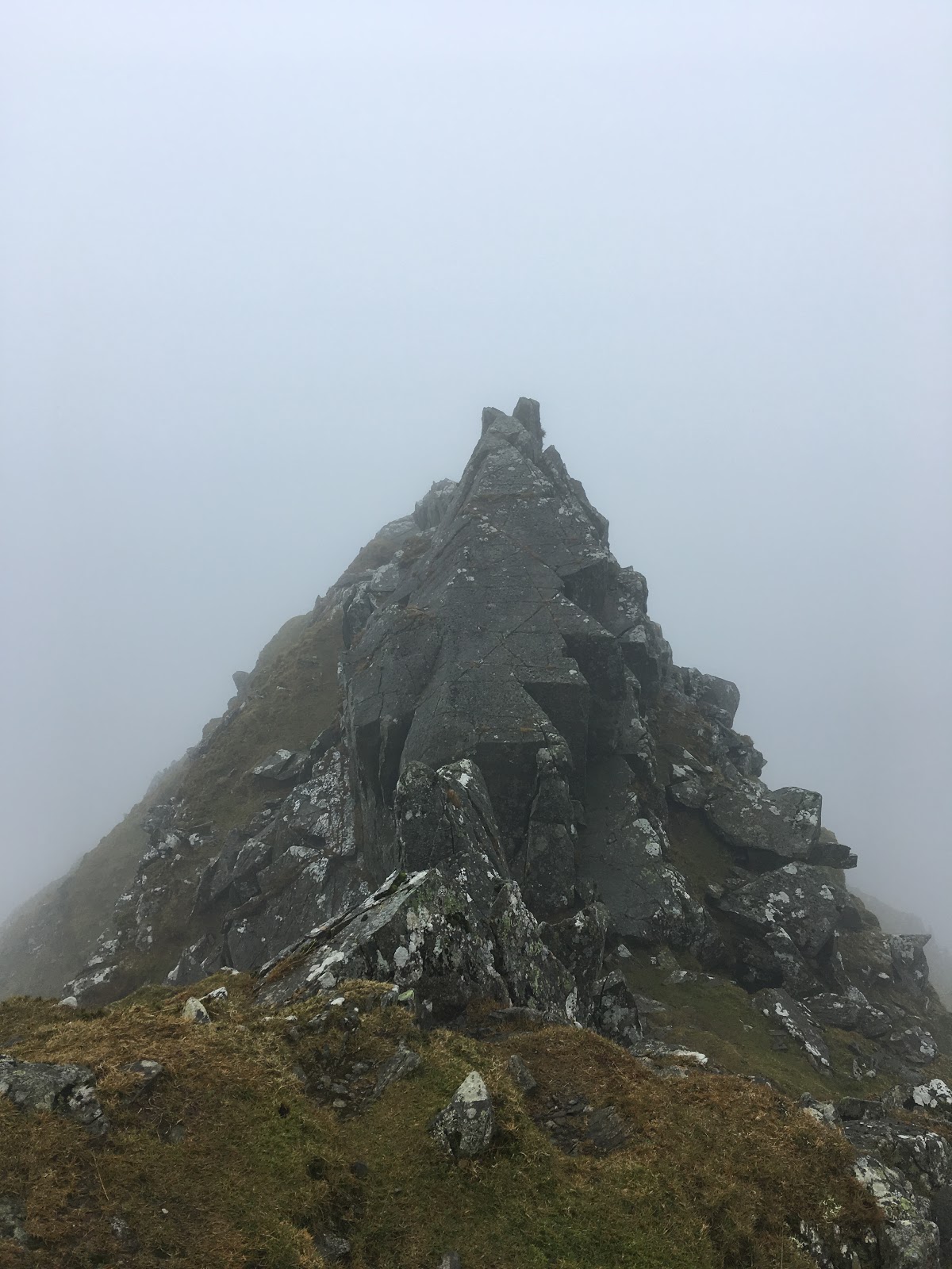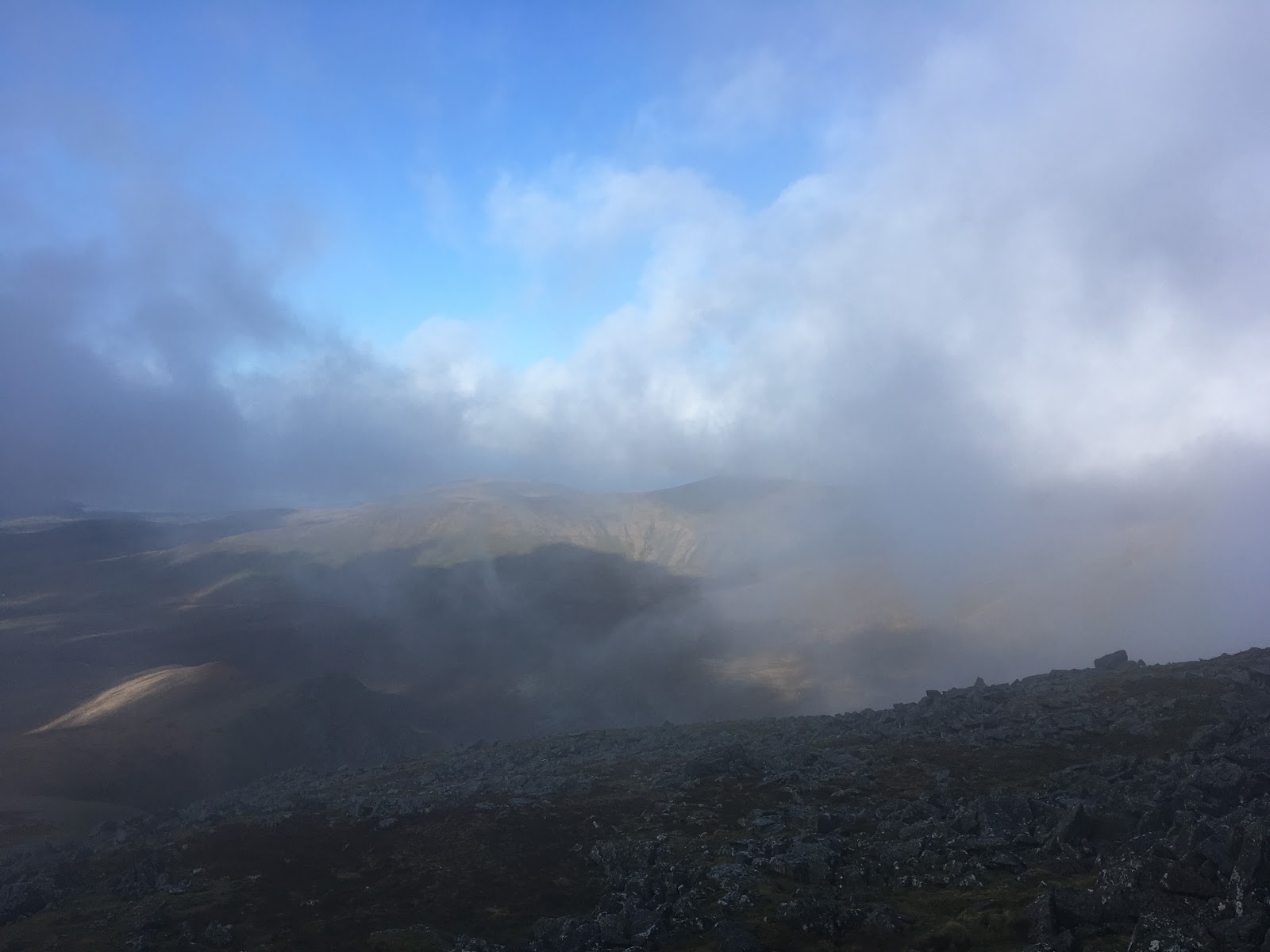 After enjoying a hot drink and the satisfaction of following a bearing through the mist, directly to the summit cairn, I set off back down (on a bearing again) the main ridge.