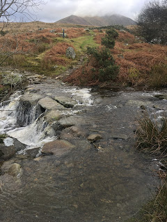Setting off from Gerlan, at the top of Bethesda, I soon came across my first obstacle! The tiny stream had swollen overnight to produce a raging torrent! It was now far too wide to jump even after balancing out into the middle of the flow on a few protruding rocks. In the end, I decided to go for it, via a series of submerged rocks. Thankfully I had good boots on which kept water from penetrating, but my left sock got a bit wet as I stood too deep for my boots at one point! Not the start I had anticipated, but exciting never the less. I squeezed the water from my damp sock and continued upwards, figuring that the levels should have dropped by my return.