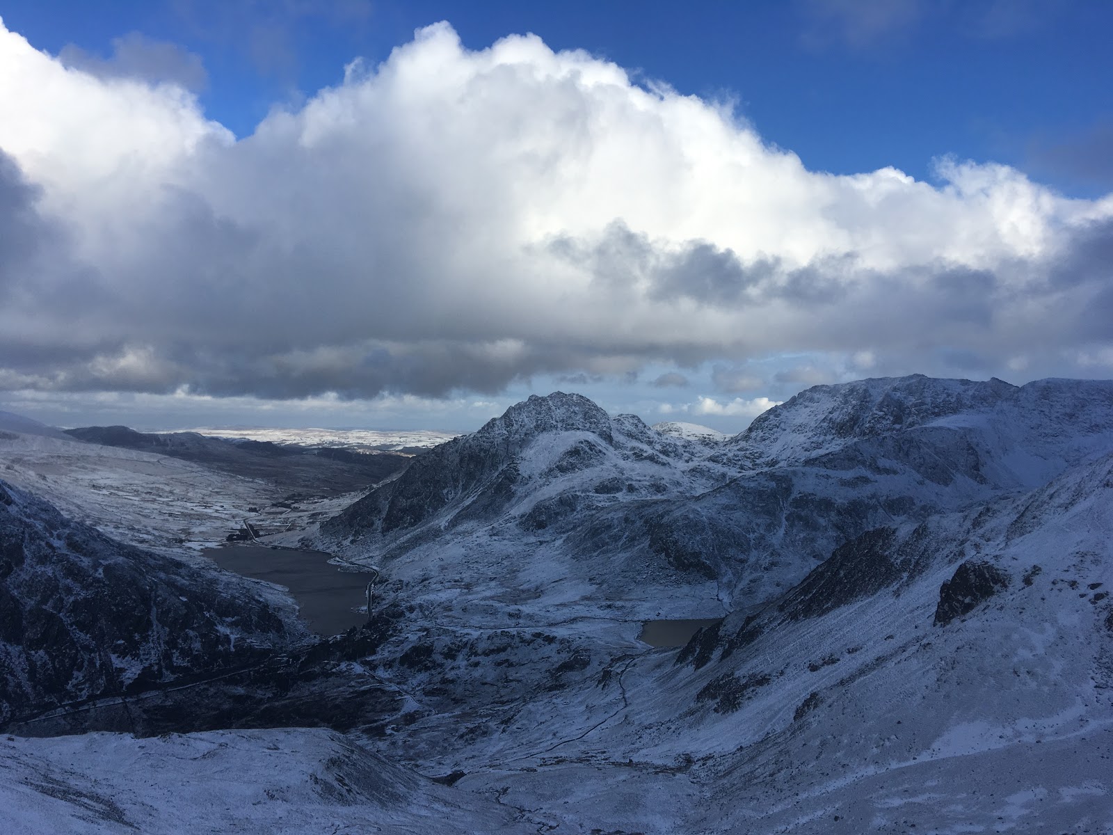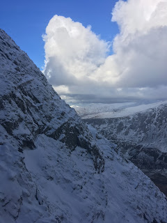 The wind was harsh up on the summit plateau, so after checking out the routes in Cwm Cinion, I descended down ‘Easy Gully’ (Gd I) and into the relative shelter of the cwm I’d climbed out of. The visibility was great, but with every big gust came a wall of spindrift snow!