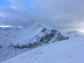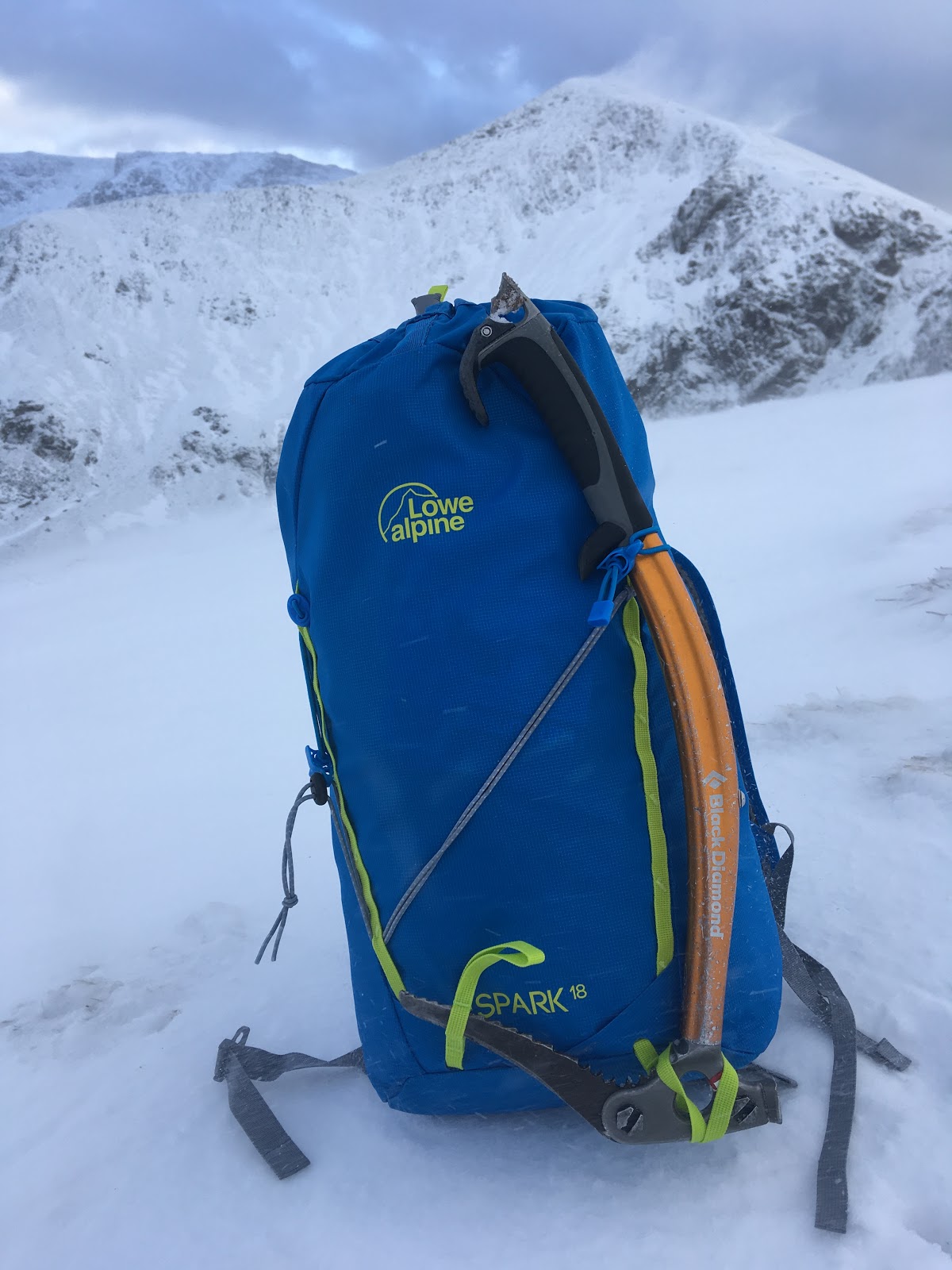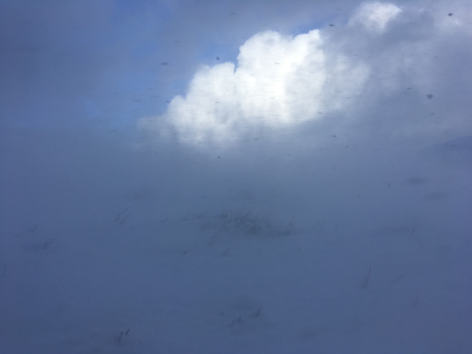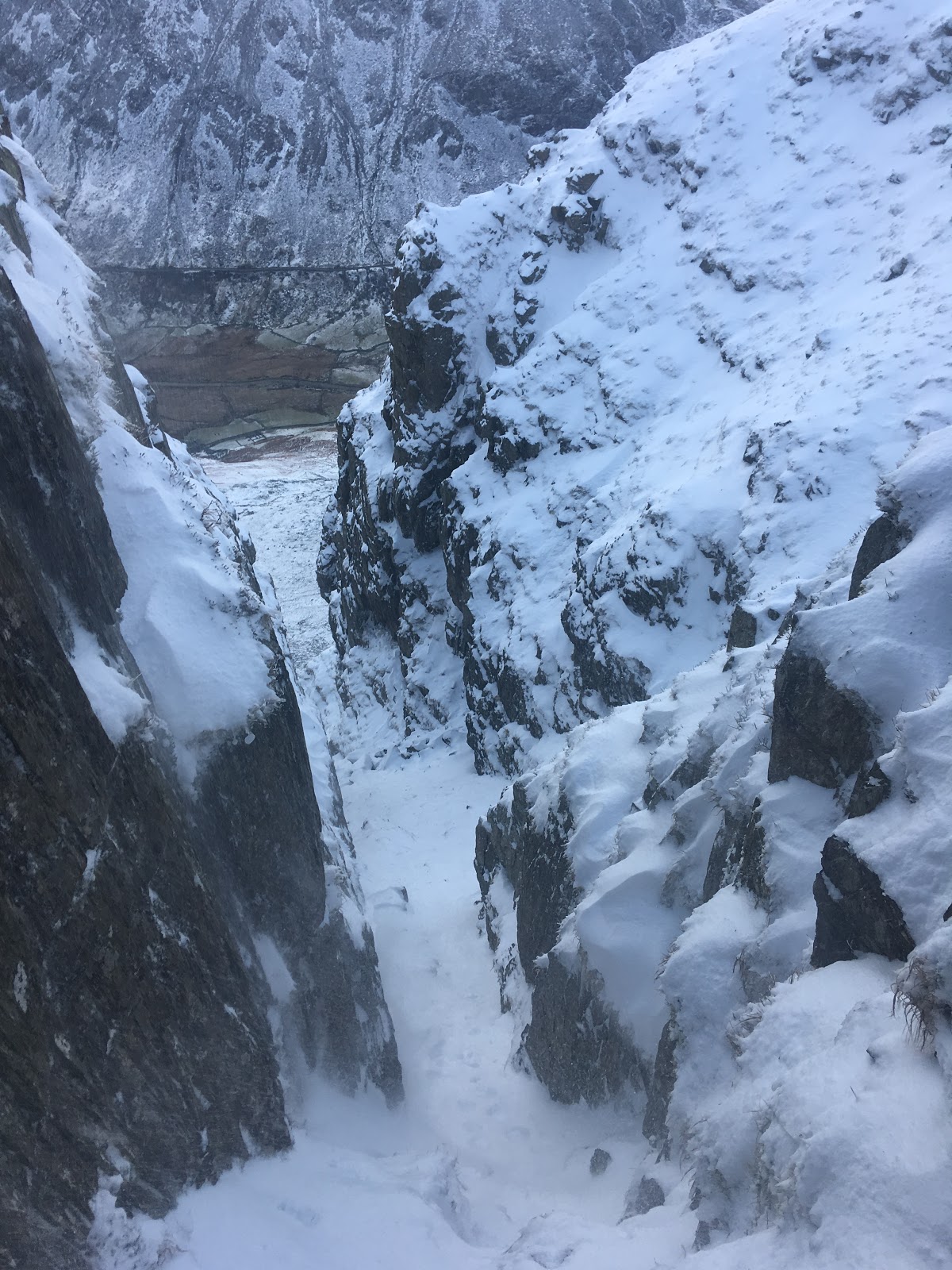 It’s a wide and straightforward gully to climb. At the top, I took the harder (right hand) exit, which gave a bit of excitement in the form of spindrift simultaneously pouring down and blowing up it as I climbed. Thankfully, the snow and tuft gave solid axe placements, so with eyes squinting as best I could, I hacked on upwards to the top before I drowned!