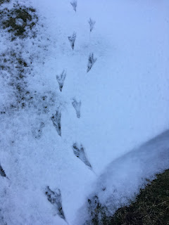 It was cold in the cwm and now there was a strong wind blowing last nights snow around. This morning it had snowed heavily at The Cottage and covered the grass, but most of the mountain snow seemed to be blowing around in the air.