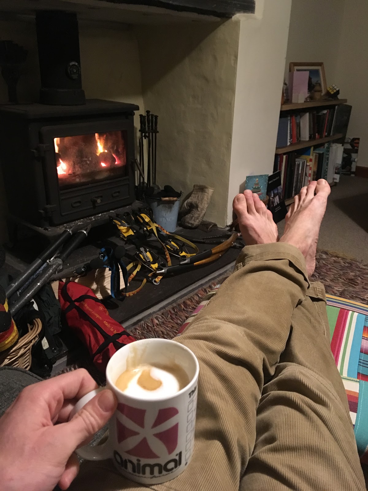 I kept my crampons and goggles on almost all the way back to the van. I didn’t take long to get established back at The Cottage for thaw out chill out. Brilliant.