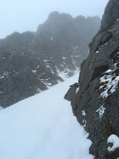 The walk up to Cwm Lloer was beyond saturated. Water was pouring off the hill side thanks to the combination of falling rain and melting snow. I pressed on regardless, curious to see how much snow remained higher up. A lot of snow was packed into the Cwm still, but the gully I was aiming for was soft and wet and was going to prove to be un-necessarily hard work. I opted to scoot up the classic Grade 1, Broad Gully as the snow seemed just about packed in enough to prevent any major floundering.