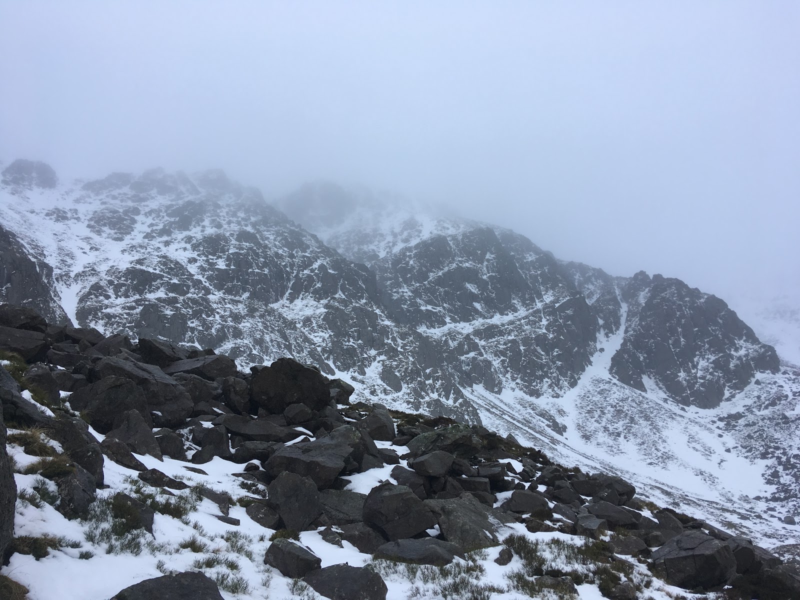 ‘Soft’ would be the word to best describe the snow conditions today. Soaking wet, saturated and unfrozen, would also be fair descriptors! Utterly grim weather has blasted across the park, with rising temperatures and incessant rain on the back of a fairly strong warm wind. All in all, not quite the alpine experience I had been planning in my mind.
