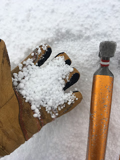 The weather was calm and I was enjoying myself immensely, getting into the rhythm of the climb. Half way up, below the narrow ice step, I kicked a ledge in the snow to give my calf muscles a quick rest. Suddenly, the wind arrived and in an instant, the situation came far more serious. Behind me and heading my way, graupel, (rimed up pellets of ice the size of peas) were falling from the sky in great quantities. As the maelstrom hit, I just had the time (and sense) to grab my goggles from my pack. Until I got them on, I was temporarily blinded by the deluge. Thankfully, I was relatively sheltered below an overhang and standing on the ledge I made just a few minutes earlier. I decided to wait a few minutes while the worst (hopefully) passed overhead.