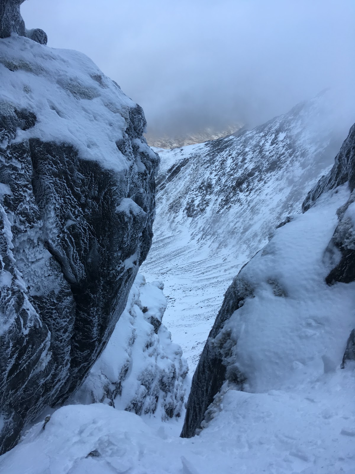 Opposite, on the other side of the Cwm, conditions where slightly sheltered and despite the now very low visibility, I was able to locate the base of Hidden Gully (not actually that hidden if you know where to look!). This gave another great climb; I exited up the easier left hand branch as it was no place to be taking chances.
