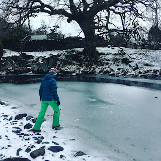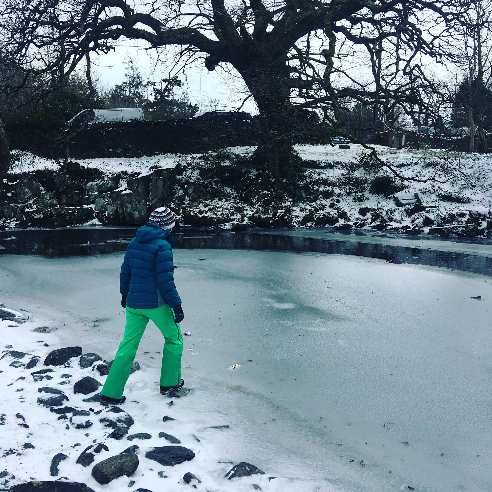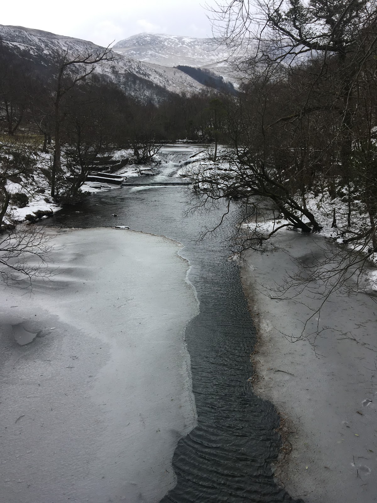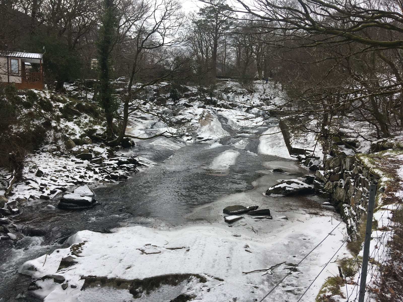 Finally succumbed to the effects of crossing both the Pacific and Atlantic in a weekend! Rest has been required. The weather has remained ferocious and we have remained tired, so we spent a local day, enjoying some short walks from The Cottage. Down in the relative shelter of the valley, we kept warm while checking out some of the nearby natural phenomena associated with this cold snap and storm. First stop was the Ogwen River, which in places was completely frozen across with ice so thick that a stone couldn’t crack it.