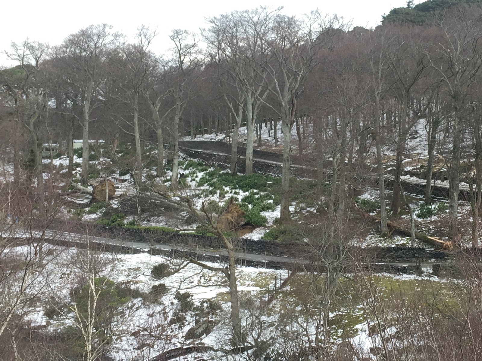 We have not had much in the way of lying snow (it all got blown away!), but the winds last night were some of the strongest we’ve had. On the other side of the river, three big beech trees had been uprooted in the night.