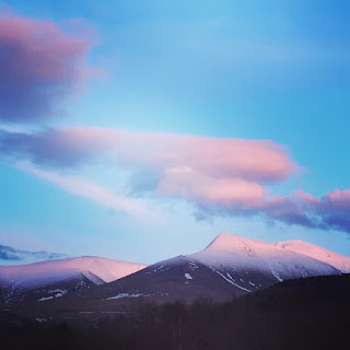 Clouds lifted this evening on my way back to The Cottage to reveal a stunning scene of fresh snow all glowing pink in the evening light. Views like this are good for the soul and just one of the reasons we live here.