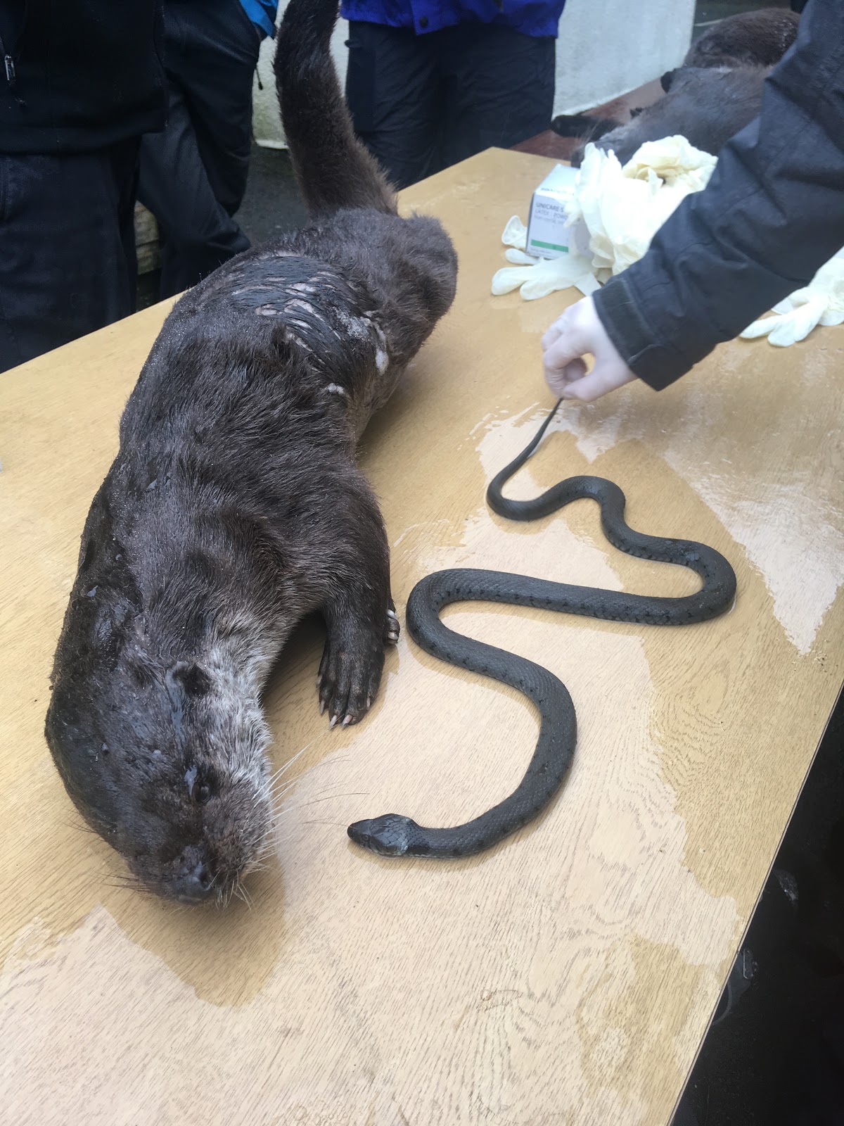 After giving us some otter poo to sniff, he then produced a frozen otter from a chest freezer for us to study! (the victim of a recent hit and run). And a grass snake! (of unknown origin)!