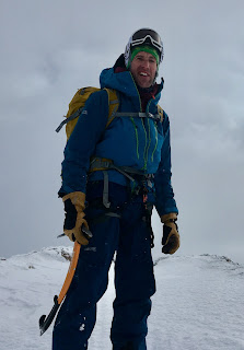 Towards to top, the wind arrived – bringing with it showers of spindrift. One minute it would be pouring down the gully, the next, it would be returning back up the gully on an updraft! It went everywhere as we scrambled to get our goggles on while temporarily blinded.