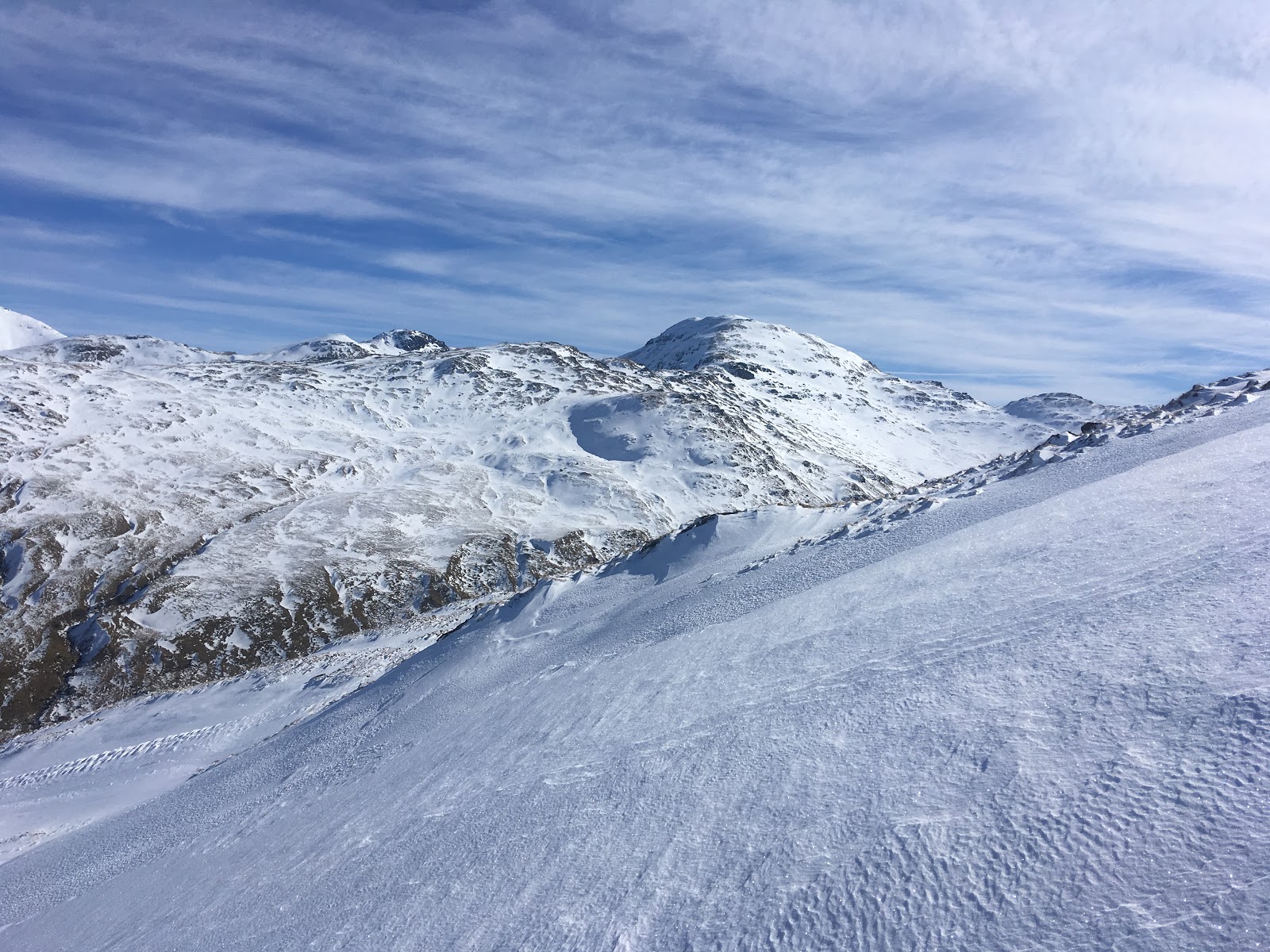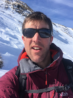 Eventually, it was time to go. Time and energy prevented a continuation along what looked like a terrific horseshoe ridge. I descended quickly down a steep gully in crampons on rock-hard snow.