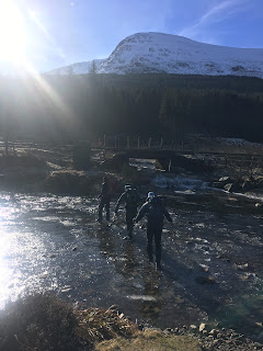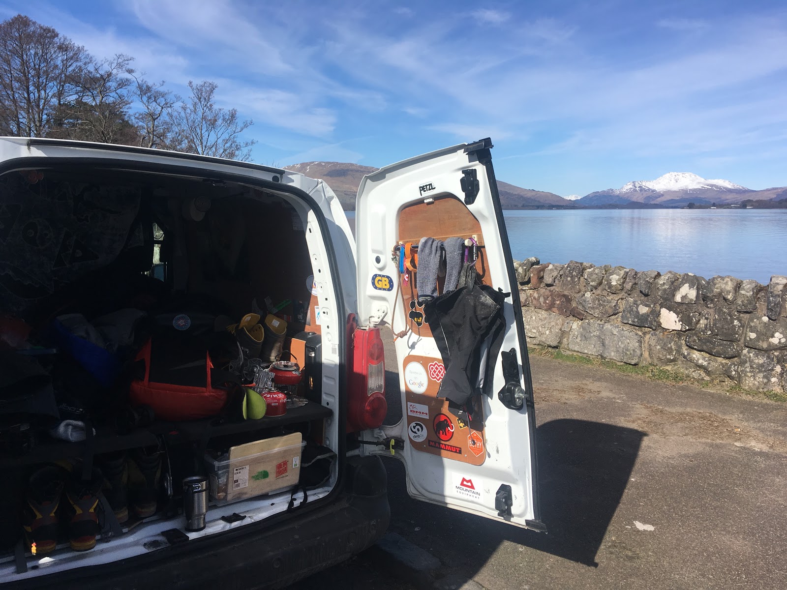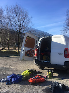 While using ones van as sleeping accommodation can have its advantages, there are also a number of disadvantages to consider. Amazingly on this trip to Scotland, I have not had need to dry any clothes or kit, as the weather has been cold but dry. However, last nights exceedingly cold temperatures meant that when I woke up this morning, my head was literally frozen to the side of the van! I was plenty warm enough in my Rab down sleeping bag, but sleeping with my hat on, I awoke to find it was frozen to the frosted metal work! I was using a rolled up fleece as a pillow and this too was frozen so hard to the back door, that I thought that it might rip when I tried to pull it off! Haha! Ah, the joys of van travel! There were some beautifully intricate crystals formed on the (inside!) of the windscreen. I was grateful once again to go inside for a cooked breakfast with Mo and not need to fire up the gas stove.