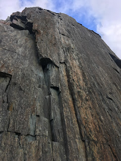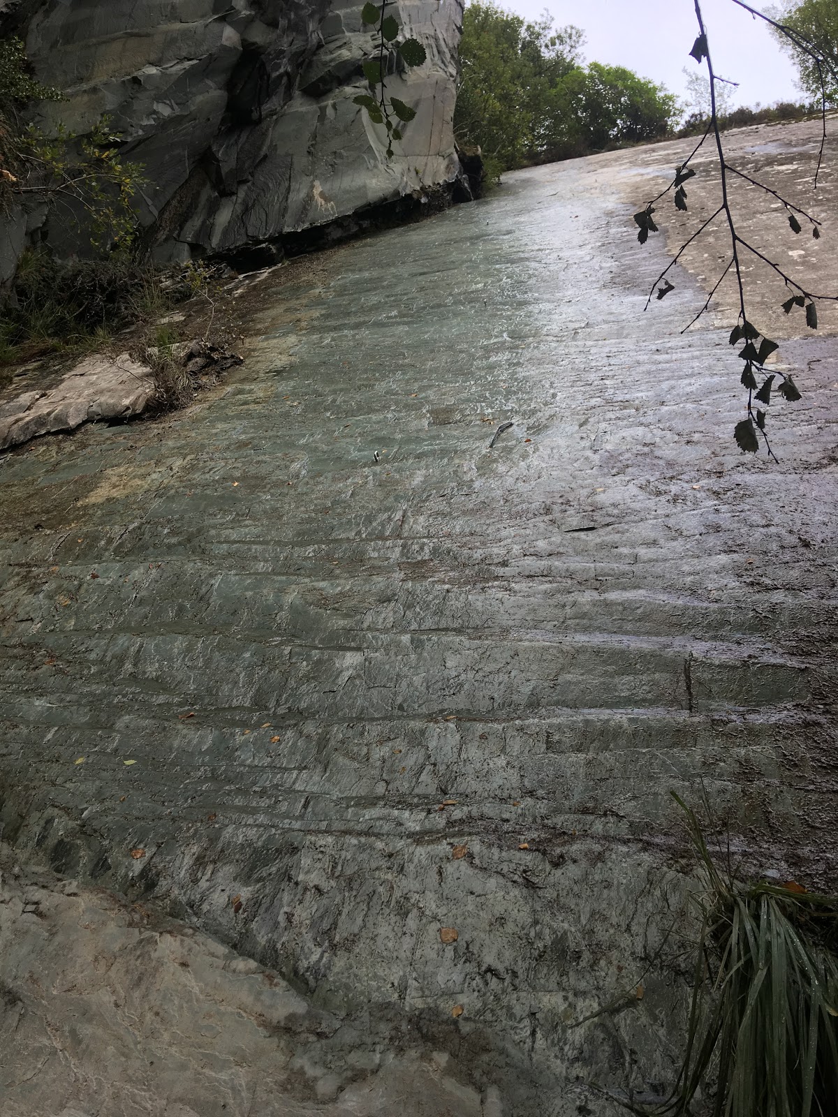 The unprecedented Britsh hot weather of summer led to a spate of new routes while we were away, on North Wales on rock, that is never normally dry. So this morning we went to try out a new route on the slate slab next to Massabula at Bus Stop Quarry. From the car, it looked like a good clean piece of rock, but on arrival at the base, we found that it was literally pouring with water! Will it ever be dry again!?…