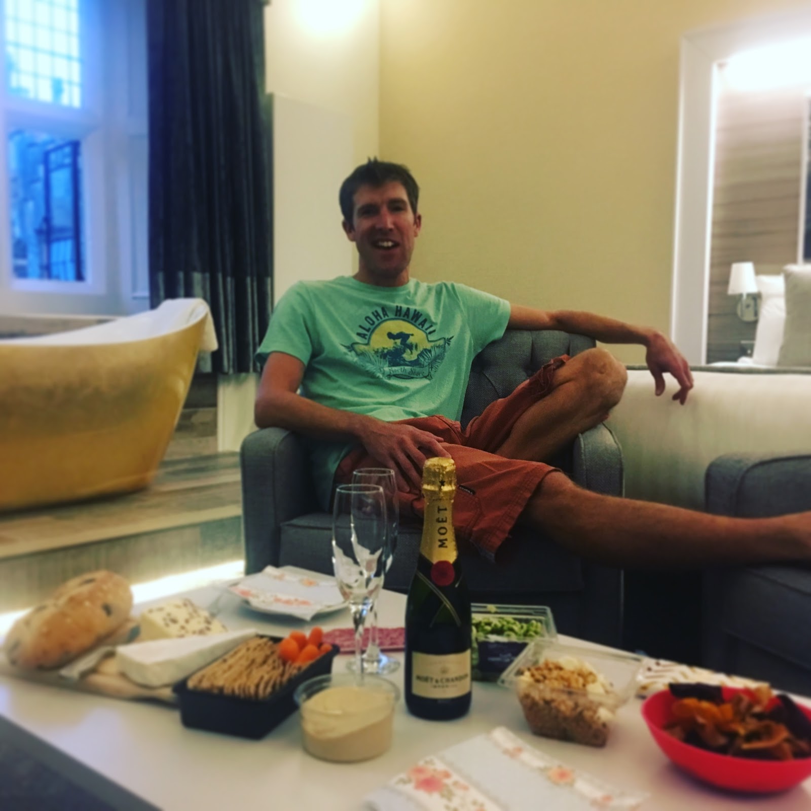 Chilled champagne and fine foods were served in the room after we’d warmed back up from the surf. We were both buzzing at the amazingness of the place and reliving our waves, while I was given more pressies, cards and read all the texts and emails that had been accumulating during the day. A great day indeed. Thanks for all your well wishes. It was a little overwhelming. Sleep came easily.