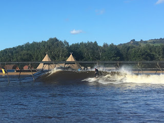 It was a bit frustrating at first as I missed the first few waves. I was trying out a new surf board, but the waves I did catch were fantastic. Once I’d worked out the best place to catch them and how the water was moving, it got much better. Clare caught almost every wave and rode them all the way to the end of the lake! Our session finished at 7pm, so we got changed as quickly as we could and drove a short distance back up the valley, to an old hall that is being refurbished into a hotel. We parked the van up next to the Audis and BMWs and checked straight in.