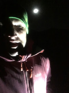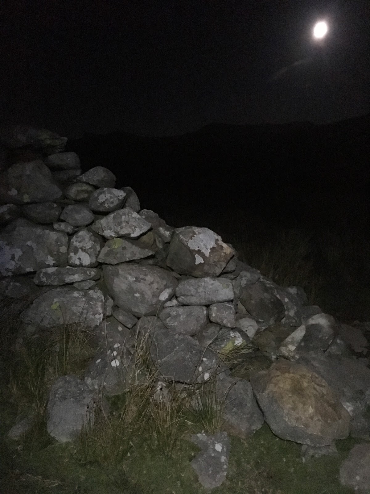 To save time, I decided to go up our closest peak, Moel y Ci, and after a mere four minutes drive, I was setting out into the night. I didn’t need my torch as the moonlight was bright enough to see by and cast my shadow on the wall as I walked to keep me company. It didn’t take long to reach the summit, from where I could see the mountain silhouettes to the south and the bright lights of Bangor and Anglesey to the north.