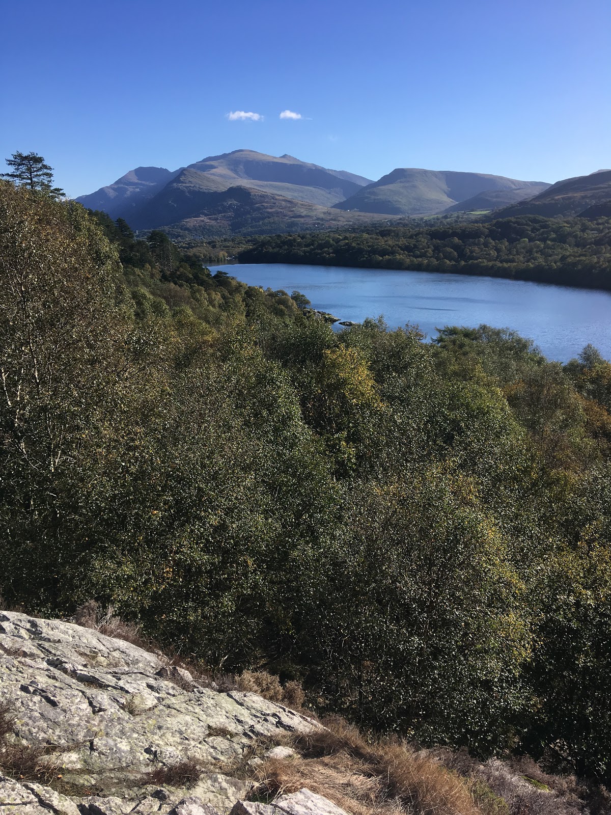 Later we found a bigger cliff to climb, up above the trees, where the views across to Snowdon were first class! T-Shirt weather in the direct sunlight…