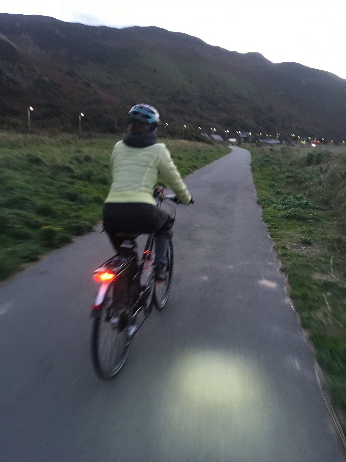 Our dynmo lights lit the way as we set off home – this time with the wind behind us.