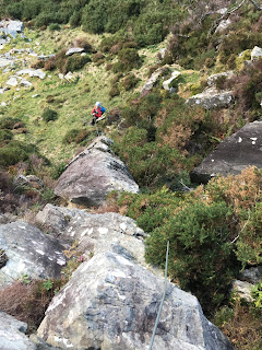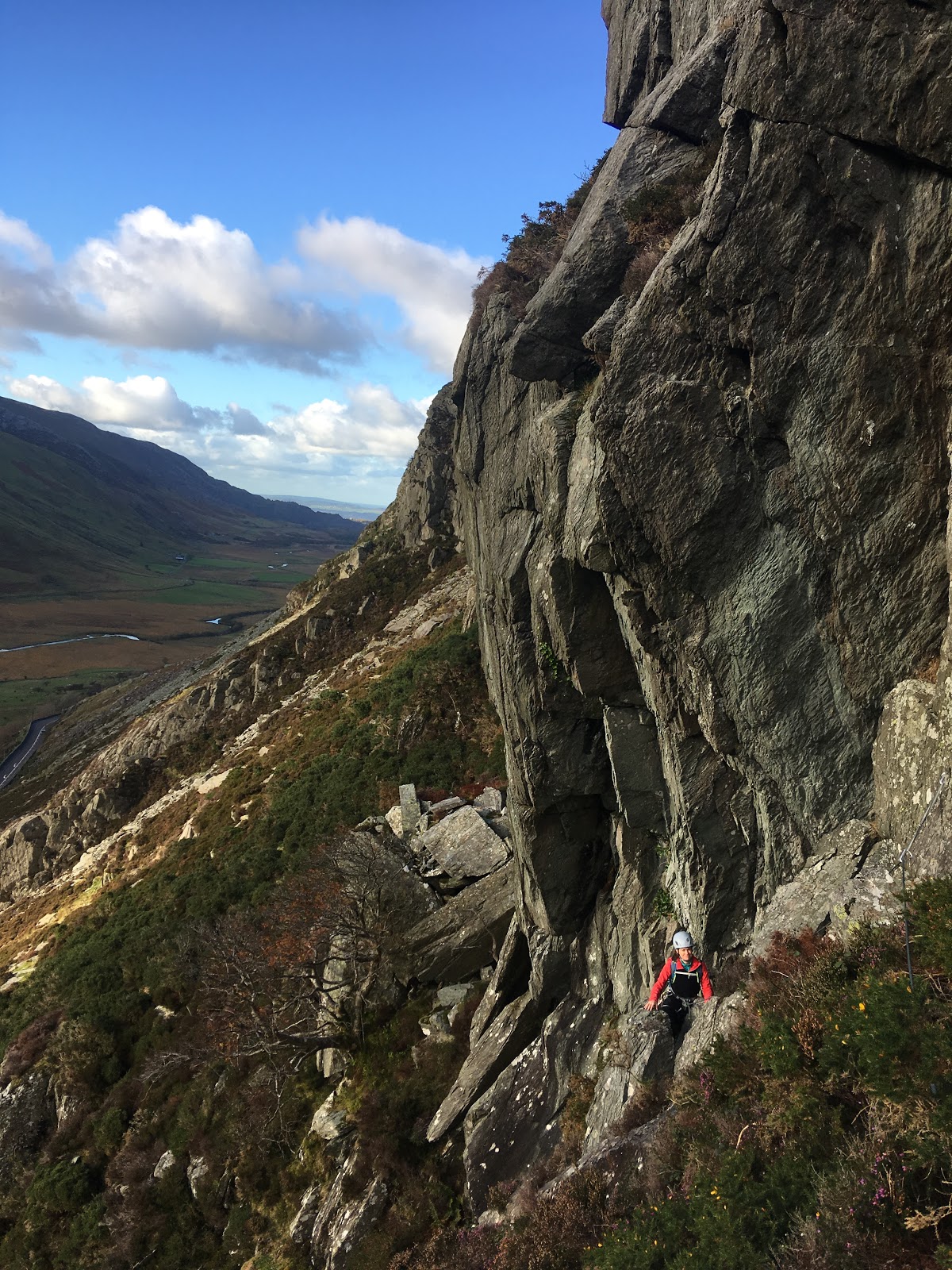 Clare, having battled her way up to my high point, took over the lead on a section of clean, rough rock while I basked in the afternoon sunlight dangling from my dramatic hanging stance. Progress however, was soon halted though by the presence of an impenetrable section of gorse, which was covering our exit slab.
