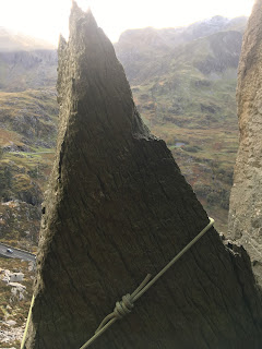 Leaving Clare on the wooden wedge stance, I investigated around the other side of the cliff and was delighted to find a study spike of rock that we could perhaps descend from, down the vertical south face of the buttress?