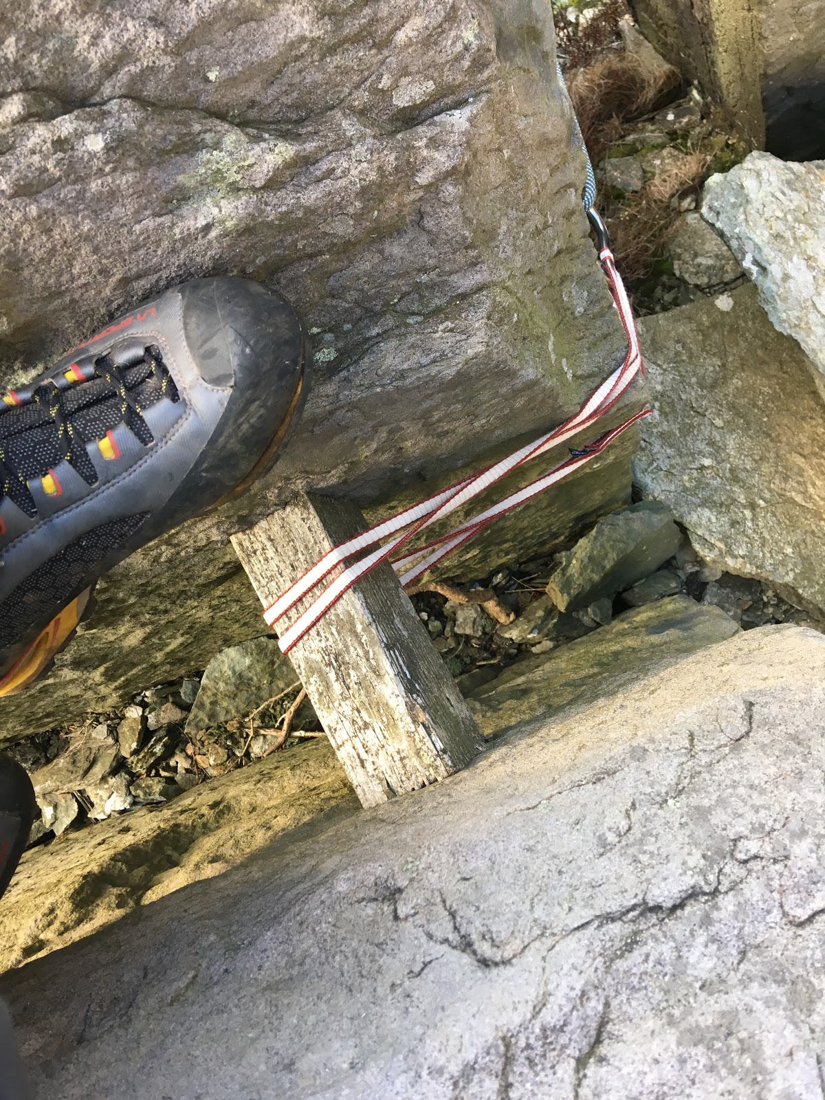 Clare (and then I), had been astonished to find a wooden post wedged between two boulders to provide a sturdy belay. We tied onto it while assessing our options. Ahead was impassable. To the side looked tricky and an abseil retreat looked to be a prickly and time-consuming affair.