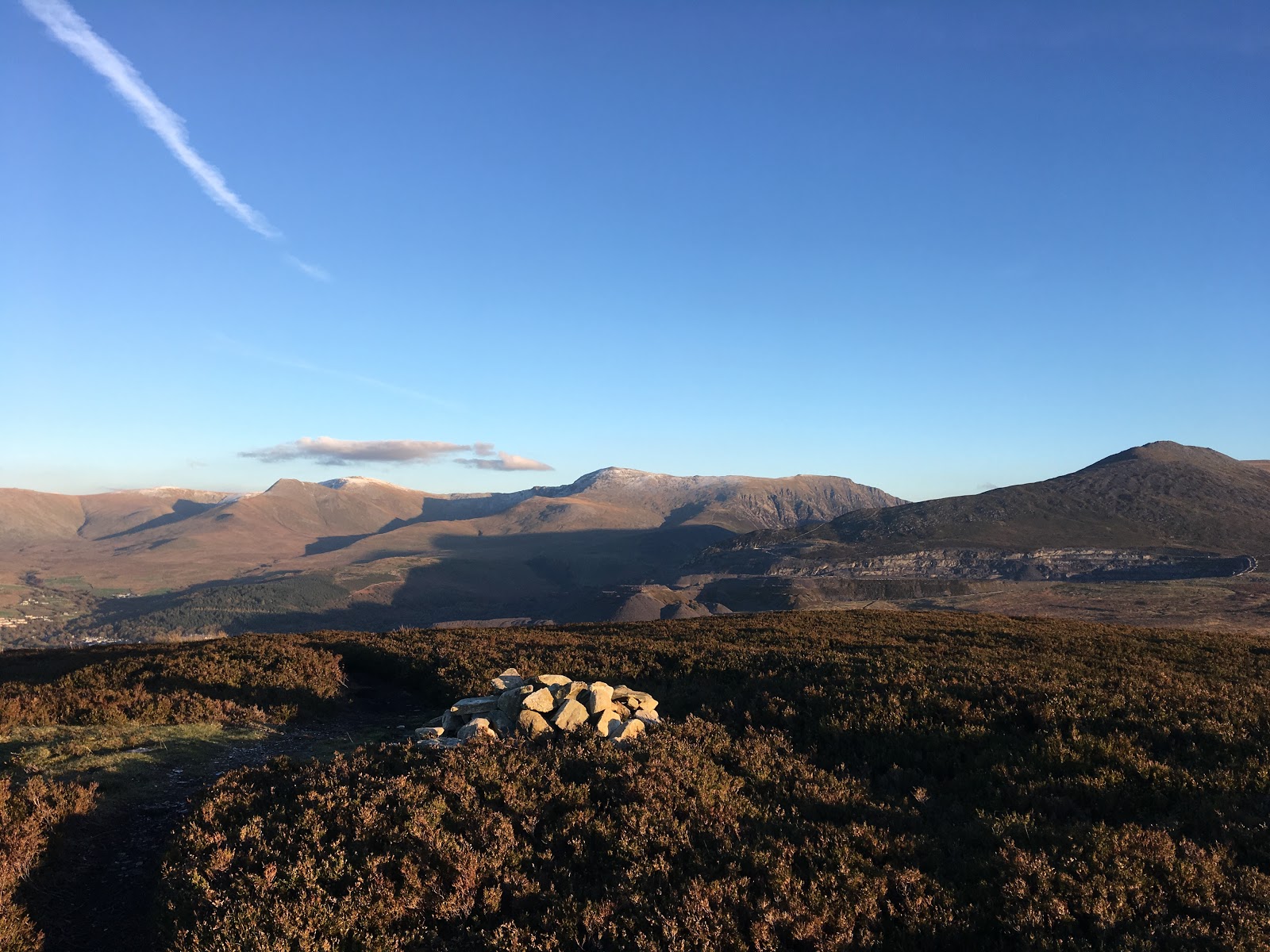 Just before dusk, we ventured up onto the hills behind the house. We’d ambitiously set off to climb a route in the slate quarry, but it was still bitterly cold. An ascent of Moel y Ci gave the best views, we decided.