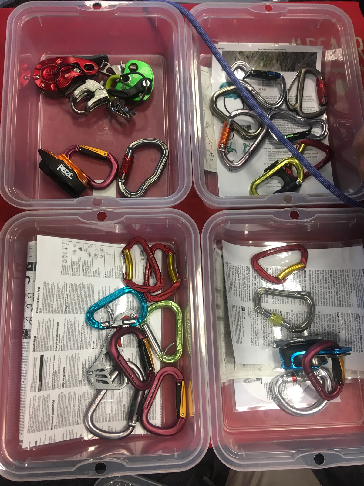 This involved a good deal of technical chat and a look through a bewildering array of belay devices and karabiners!