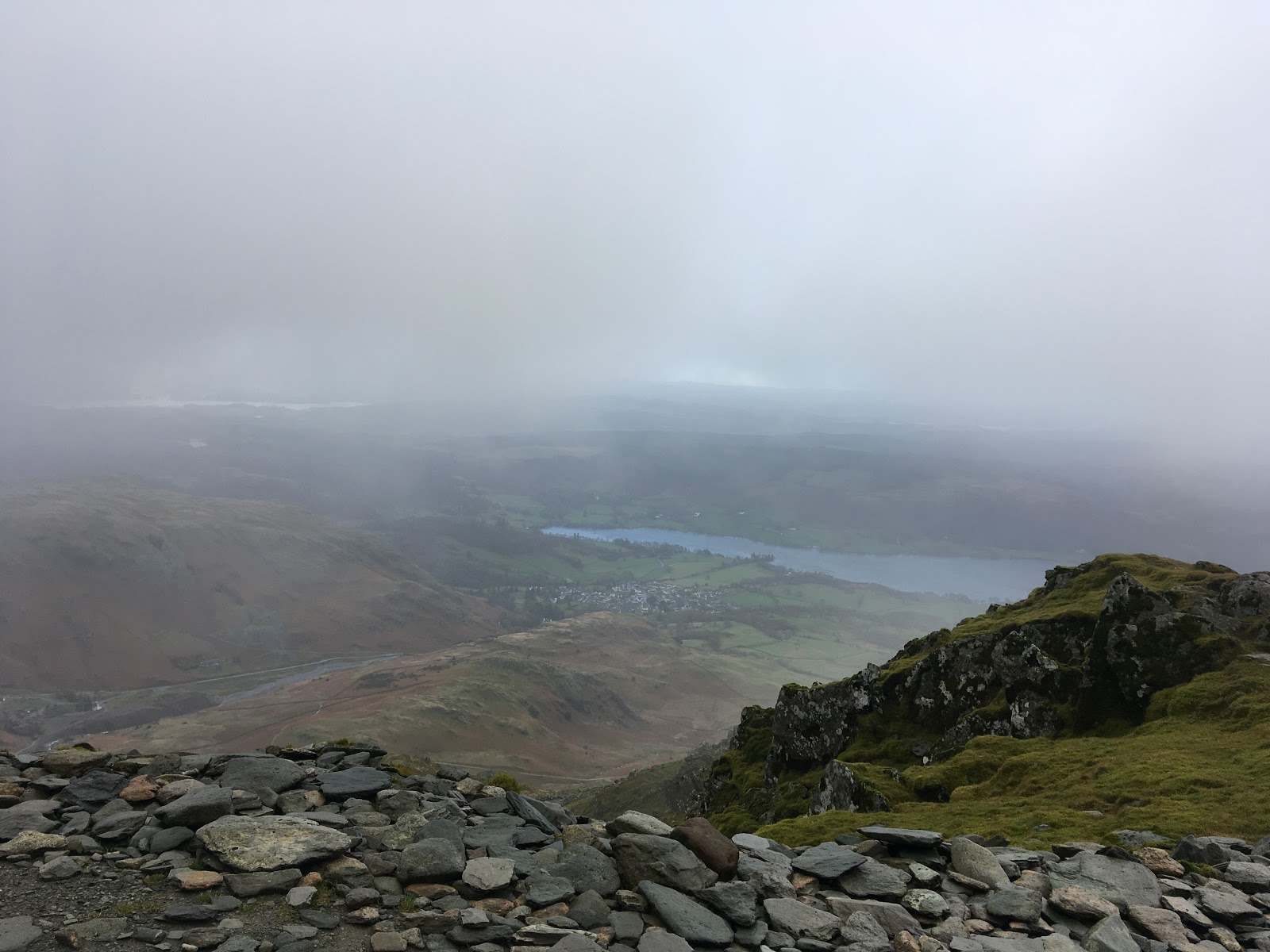 After a couple of exciting river crossings, (or Becks, as they say around these parts), we reached the very windy summit of the Old Man of Coniston, where we got some fleeting glimpses of Coniston down on the far side.
