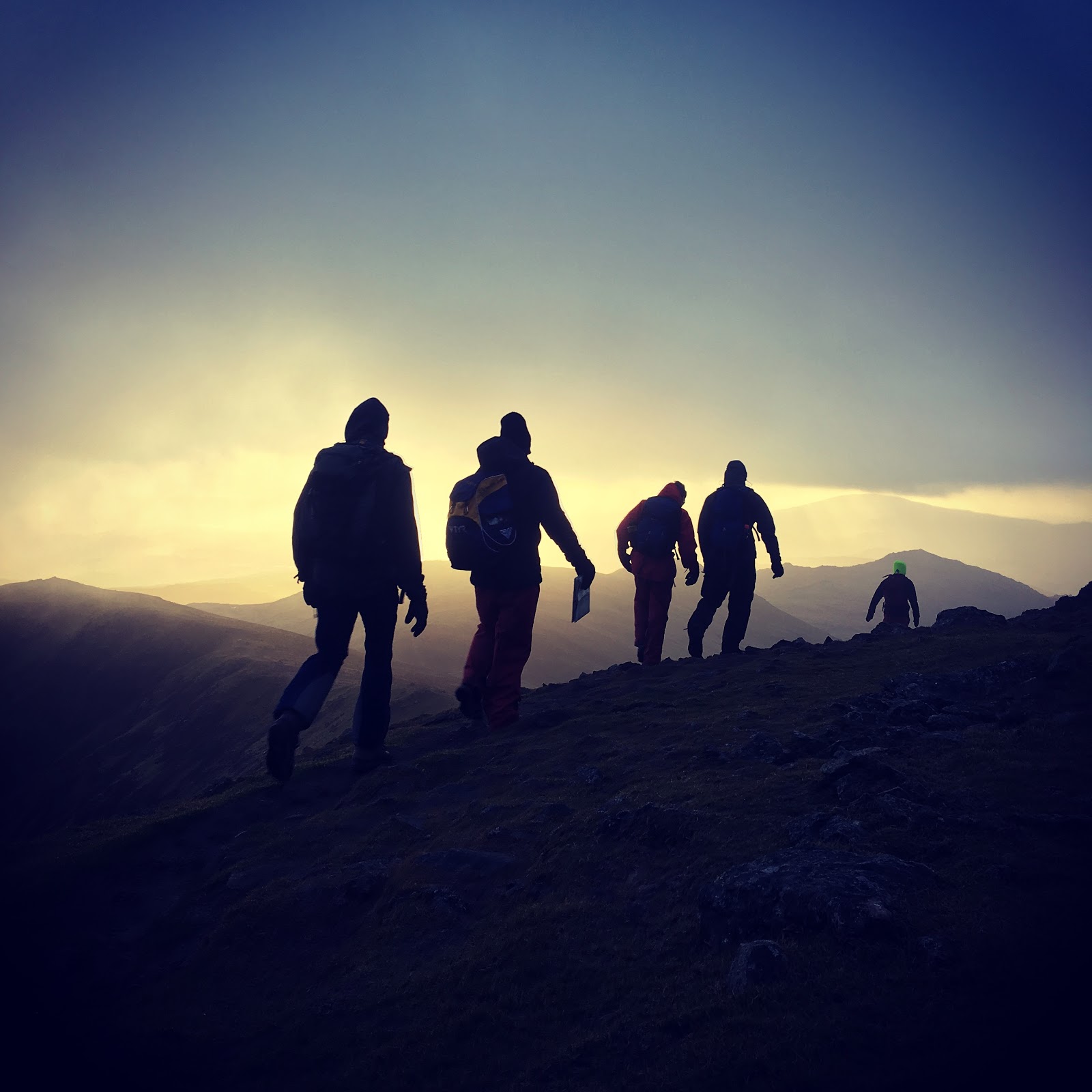 The light from the distant setting sun was superb as we made our way down to the easier ground in fading light on the Walna Scar.