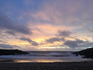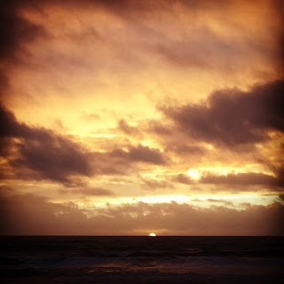The rain abated and inland, as I paddled for my last few waves, I looked up to see a vertical shaft of vibrant rainbow standing out against the dark clouds, as bright as a fresh highlighter pen. The waves thundered in, temporarily blocking out the light from the sinking sun. As they passed, I looked over my shoulder at the rays of light bursting out of the clouds on the far horizon. The colours and experience were mesmerizing and energizing. I paddled in circles, between the waves to try and take in the natural light show. When I eventually got out, I still felt warm, but was surprised to find that the left side of my face was completely numb. I changed inside the van as quickly as I could, then drove down to the next bay to check the waves there. The surf wasn’t much to shout about, but just as I pulled in, a red ball of sun hit the horizon in a breathtaking moment. It quickly vanished into the sea and I was left to drive home with the heaters on full and my mind buzzing.