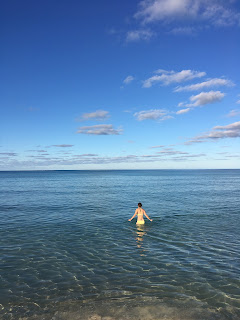 With long shadows heading across the beach, we need to be quick if we are to swim and avoid hypothermia. No time for hesitation. Clare is straight in, which means I have to follow suit.
