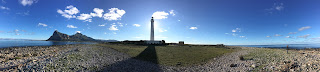 Before taking a dip, we head around to the lighthouse at the far end of the bay, where the view back over the dark peaks gives a different perspective of where we are. Our house is near the sea, below the right hand peak.