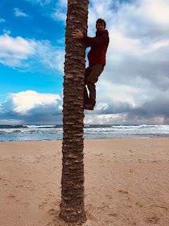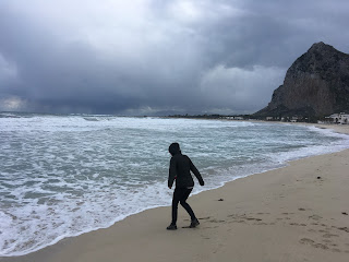 The waves were coming much further up the beach, pushed on by a very strong wind. After a blustery walk/run along the beach, we packed up and left town. But only after a farewell cappuccino in the local cafe. With it being cold outside, half of the town seemed to be packed inside. A friendly barista made us coffee and we had a few minutes of people watching inside the quirky cafe before driving to the airport in Palermo.