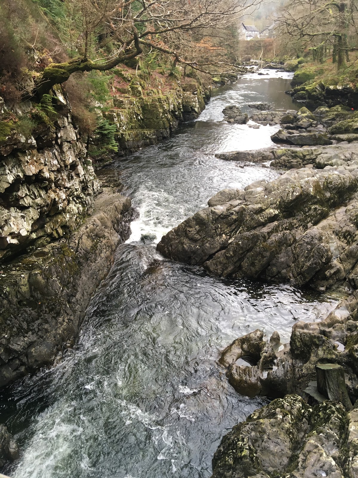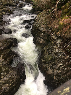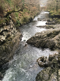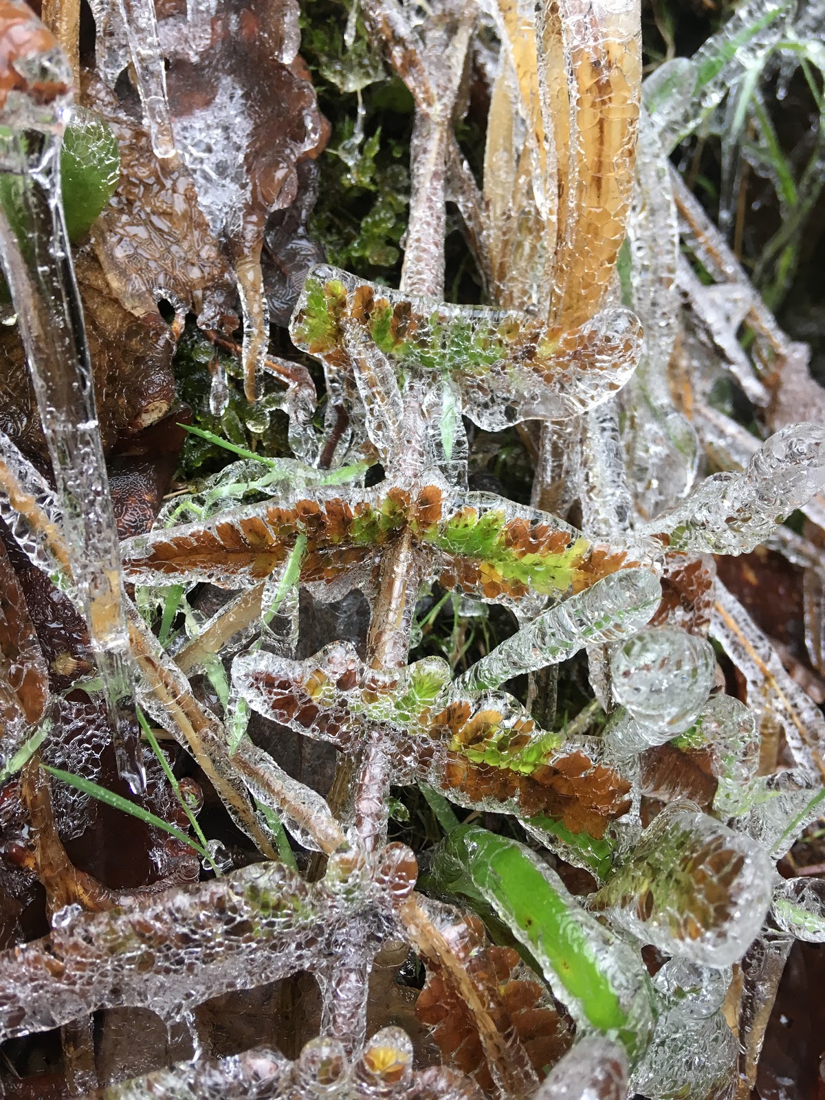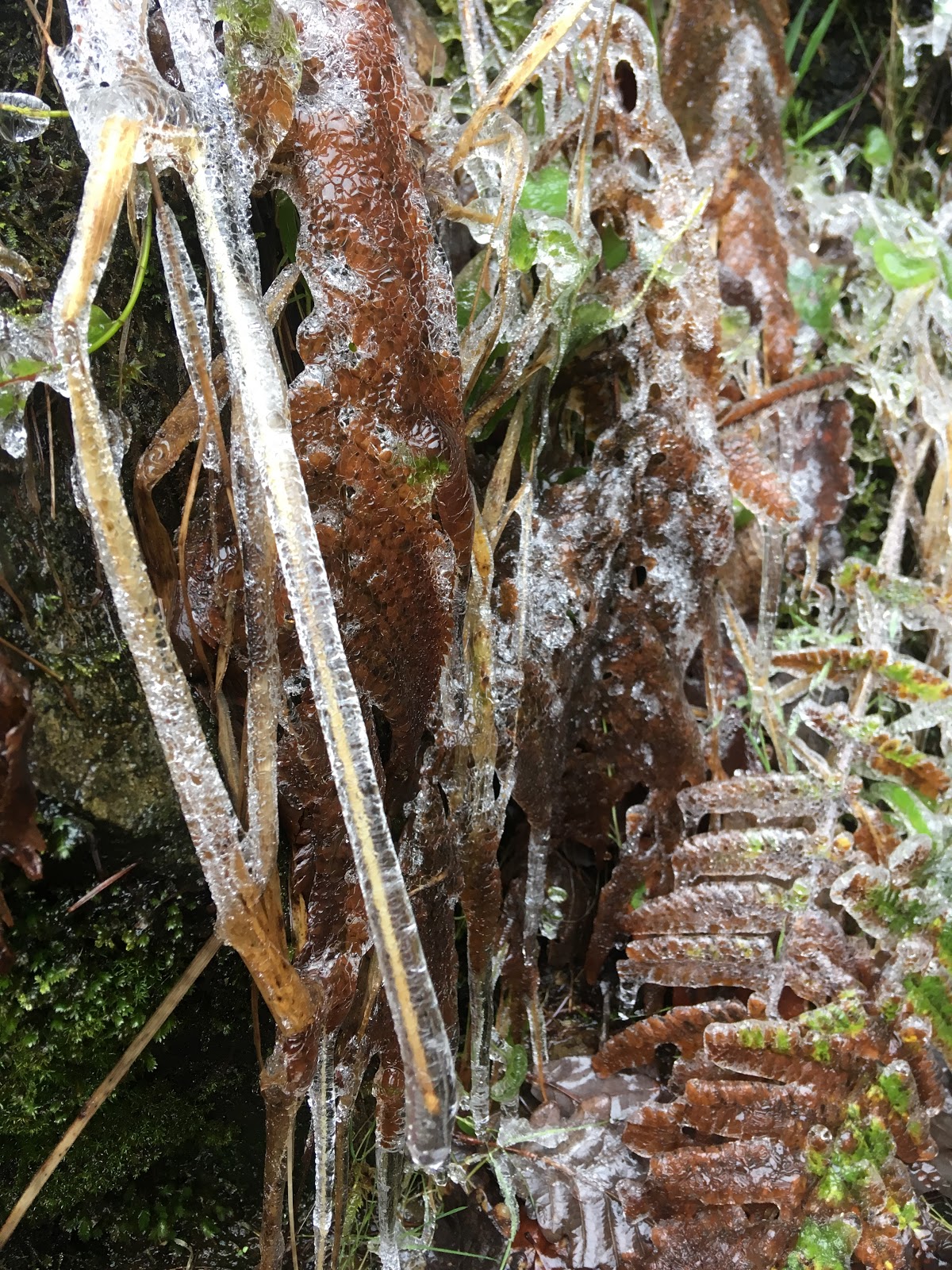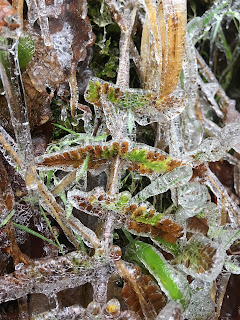 Tired team today. With weather warming to rain on the hills, we took a relaxing Sunday stroll down to Betws y coed, via the Miners Bridge, where the plants near the water were still cased in ice.