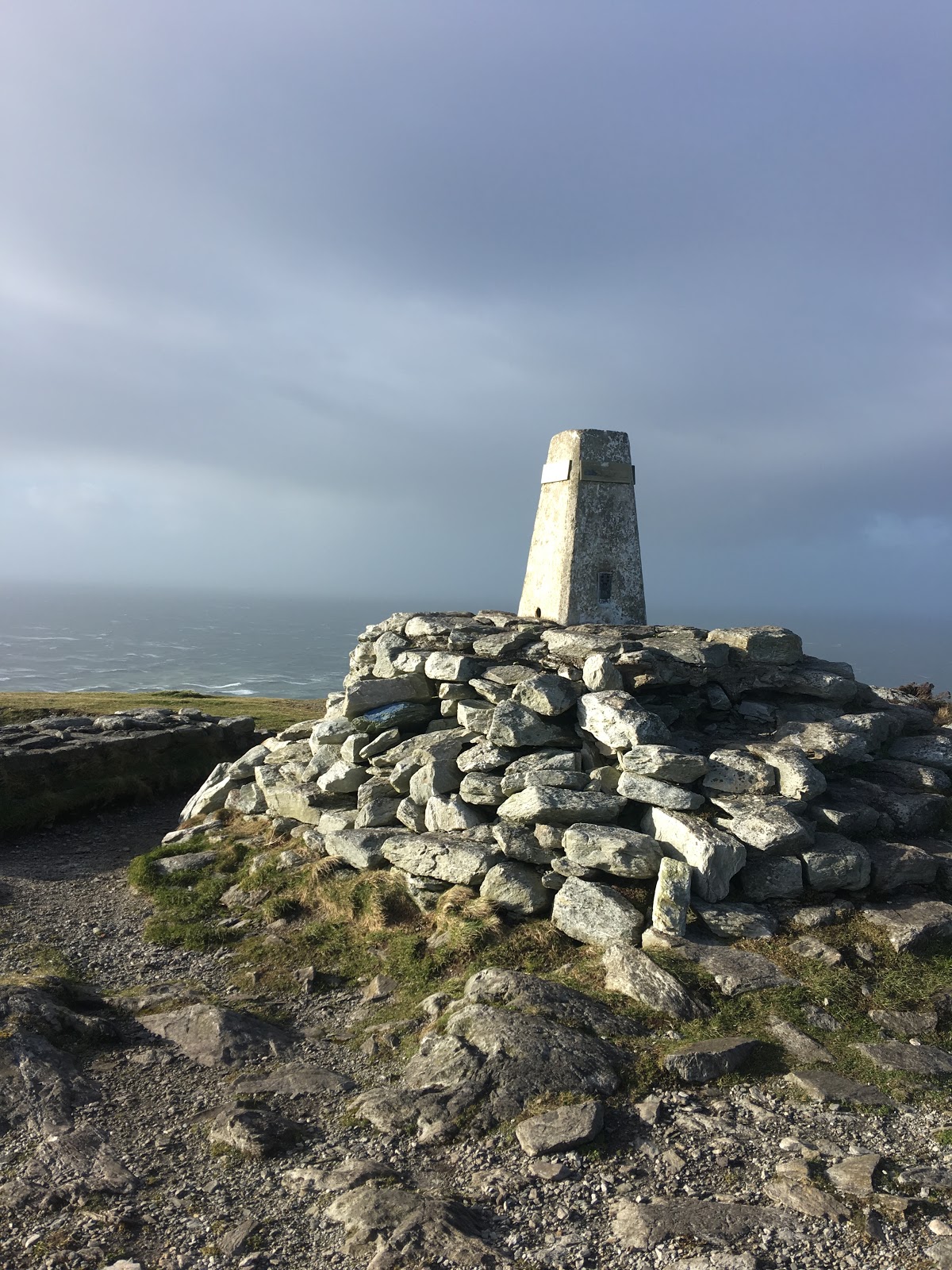 It all looks very benign in this summit photo, but we had to crawl to the trig point and hang onto it to prevent ourselves from being blown away.