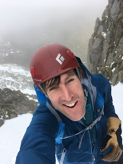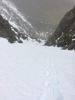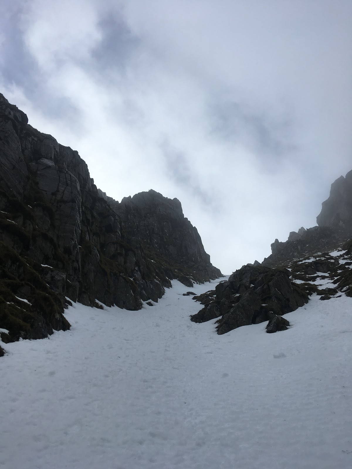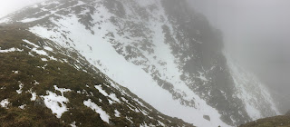 The freezing level is now well above the summits of the mountains of Snowdonia, but before all the snow melts away, I nipped out this morning for a quick lap of Broad Gully in Cwm Lloer. As I had guessed, after walking up in a warm mist, with no trace of winter to be seen, the gully was still packed full of snow.
