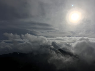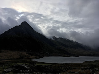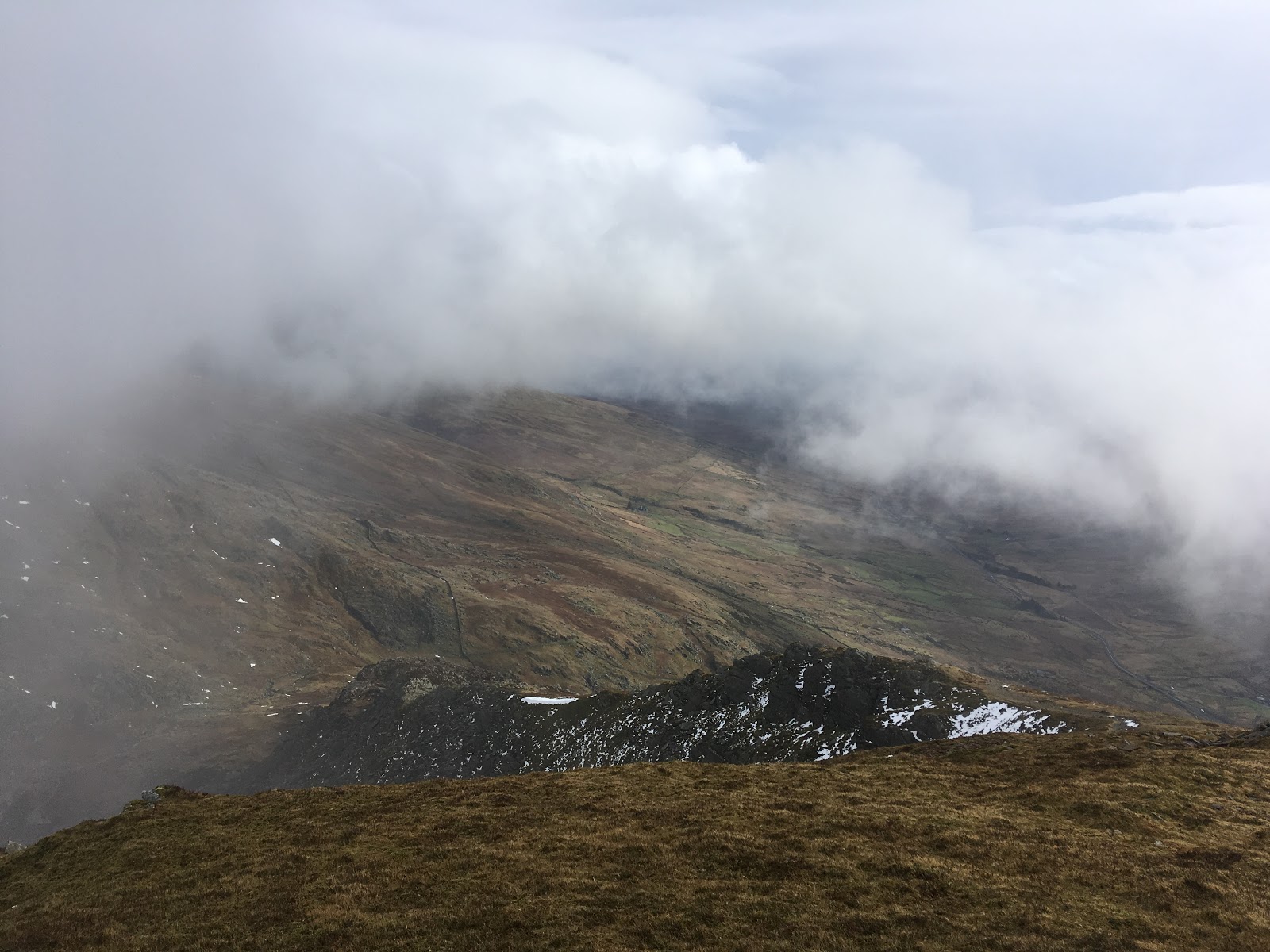 I got a glimpse of a broken-spectre in Cwm Lloer and on the other side of the valley, the summit of Tryfan appeared out of the top of the clouds in a brief inversion.