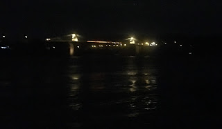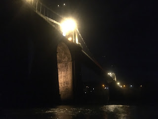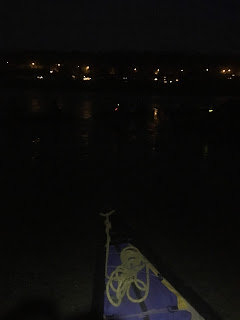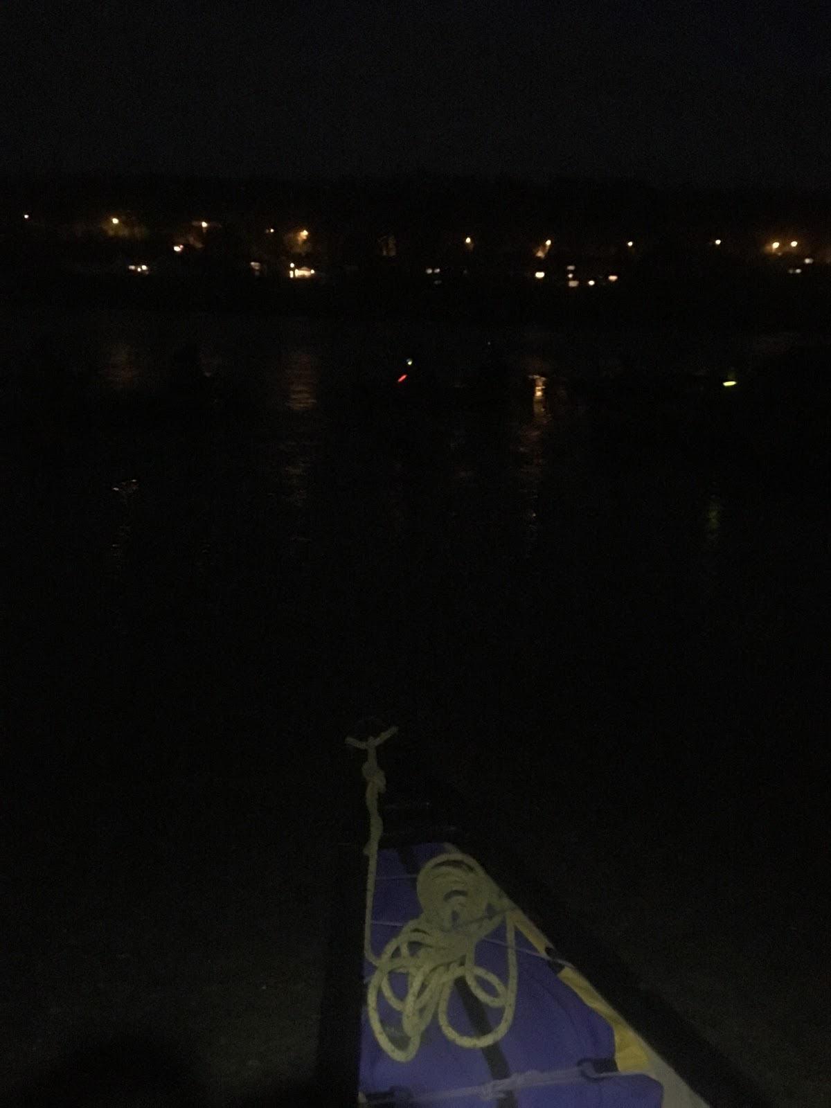 Soon the only light was that of the distant bridge and the glowsticks that were clipped to each of our shoulders. With the wind against tide, the water was particularly difficult to read and at times some waves splashed alarmingly at the side of the boats as we strained to keep them moving in the desired directions. Every now and then a bird would shriek and dark, winged silhouettes would fly overhead.