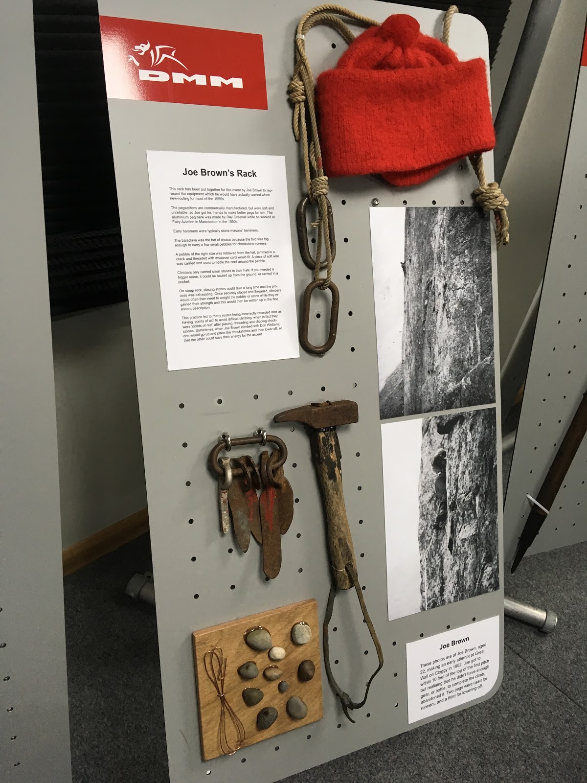 The head of DMM climbing gear also talked us through developments and even put some pebbles (which used to be used for protection) on his strength testing machine. (some of which were just as strong as modern gear, but three times as heavy!).