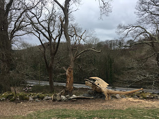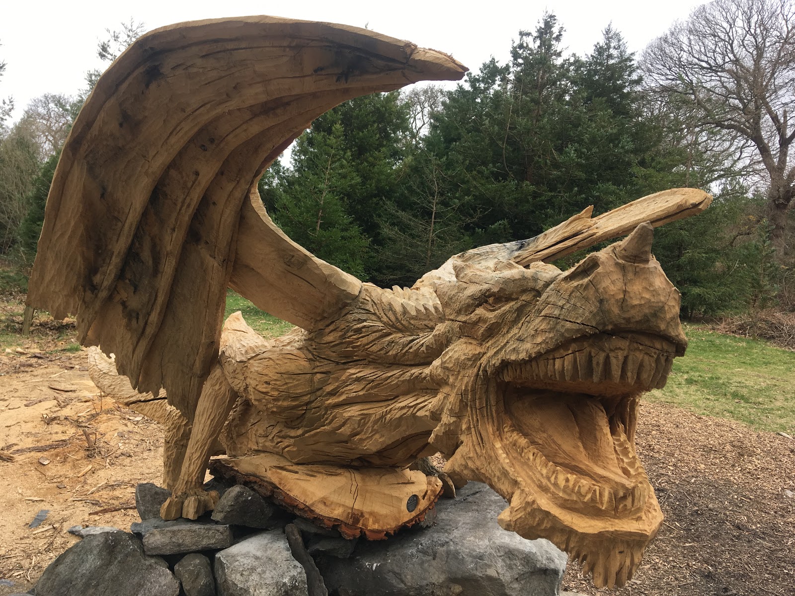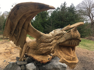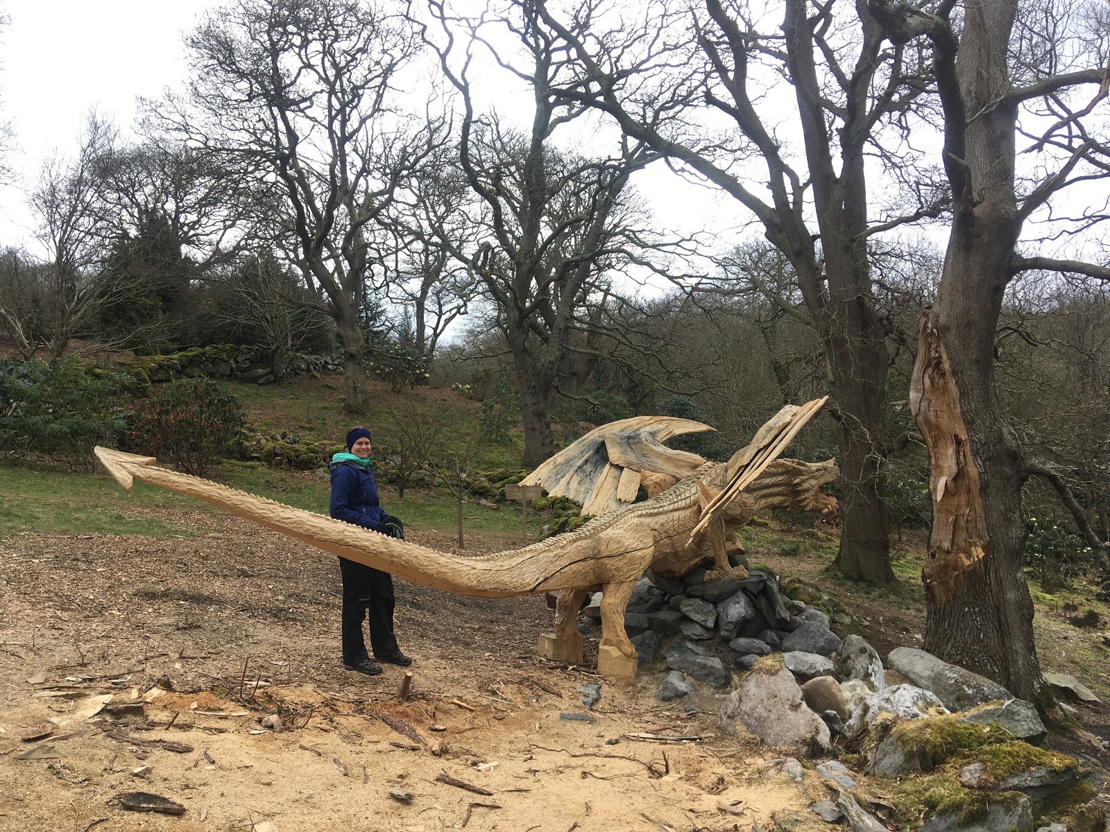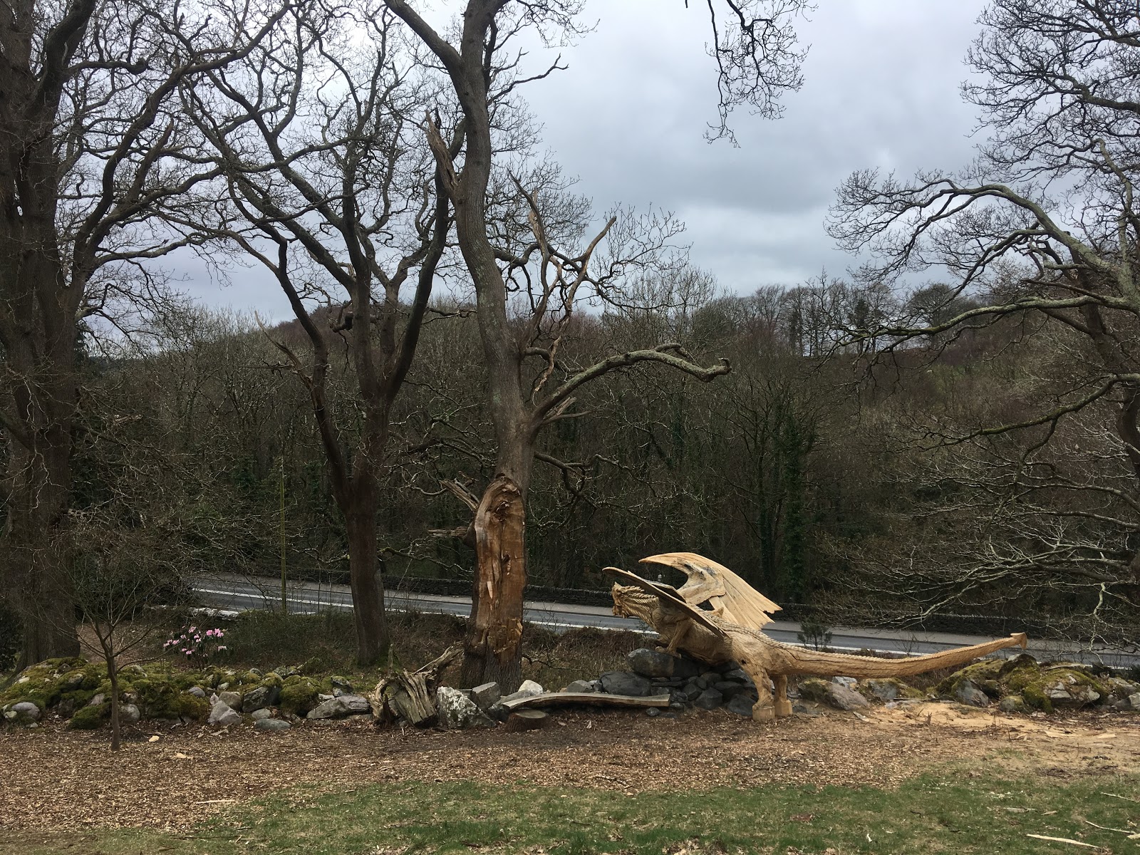 In the woods along the A5, as you drive into Bethesda, a sculptor recently carved a freshly fallen tree into a dragon. You can just about get a glimpse of it as you drive past, but this morning we decided to take a closer look. With rain forecast later in the morning, we jumped on our bike to quickly check it out while it was still dryish.