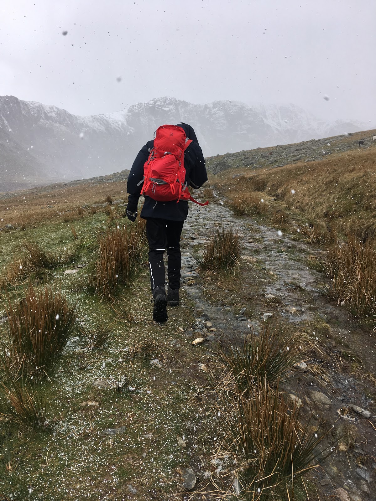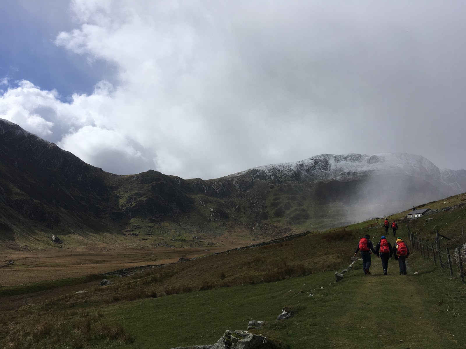 As we reached the main bend in the valley, the ‘weather’ appeared from the north – it was only a matter of time until it hit us! (Just long enough to get hood and zips up!).