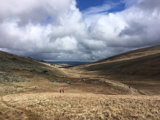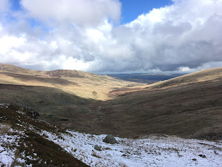 Having crossed the high plateau in conditions which were ideal for my lesson of teaching compass bearing travel in extemis, we descended to the positively summery valley of Cwm Dulyn.