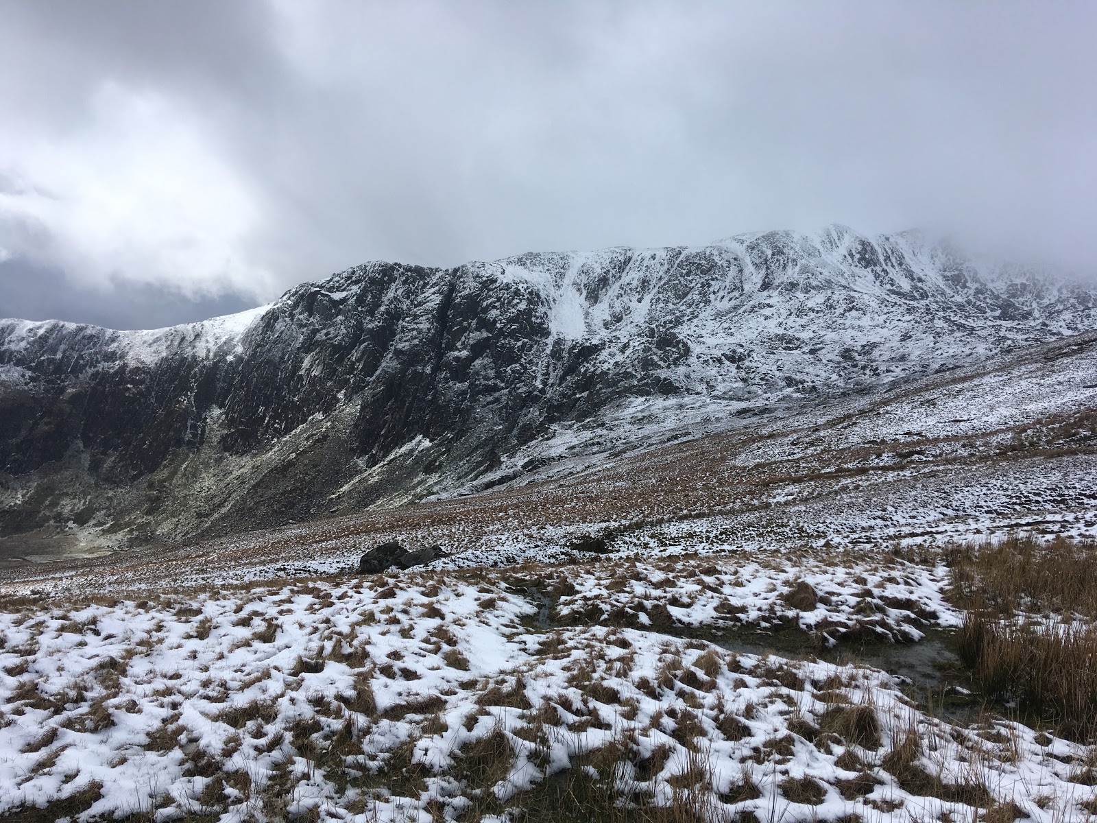 Googles and facemasks would have been a useful addition to our kit today. Between the bright and sunny spells, there have been some fierce hail and snow storms passing through. To give ourselves a bit of shelter we walked into Cwm Eigiau today, which is not somewhere I often frequent. It had a really remote feel to it.