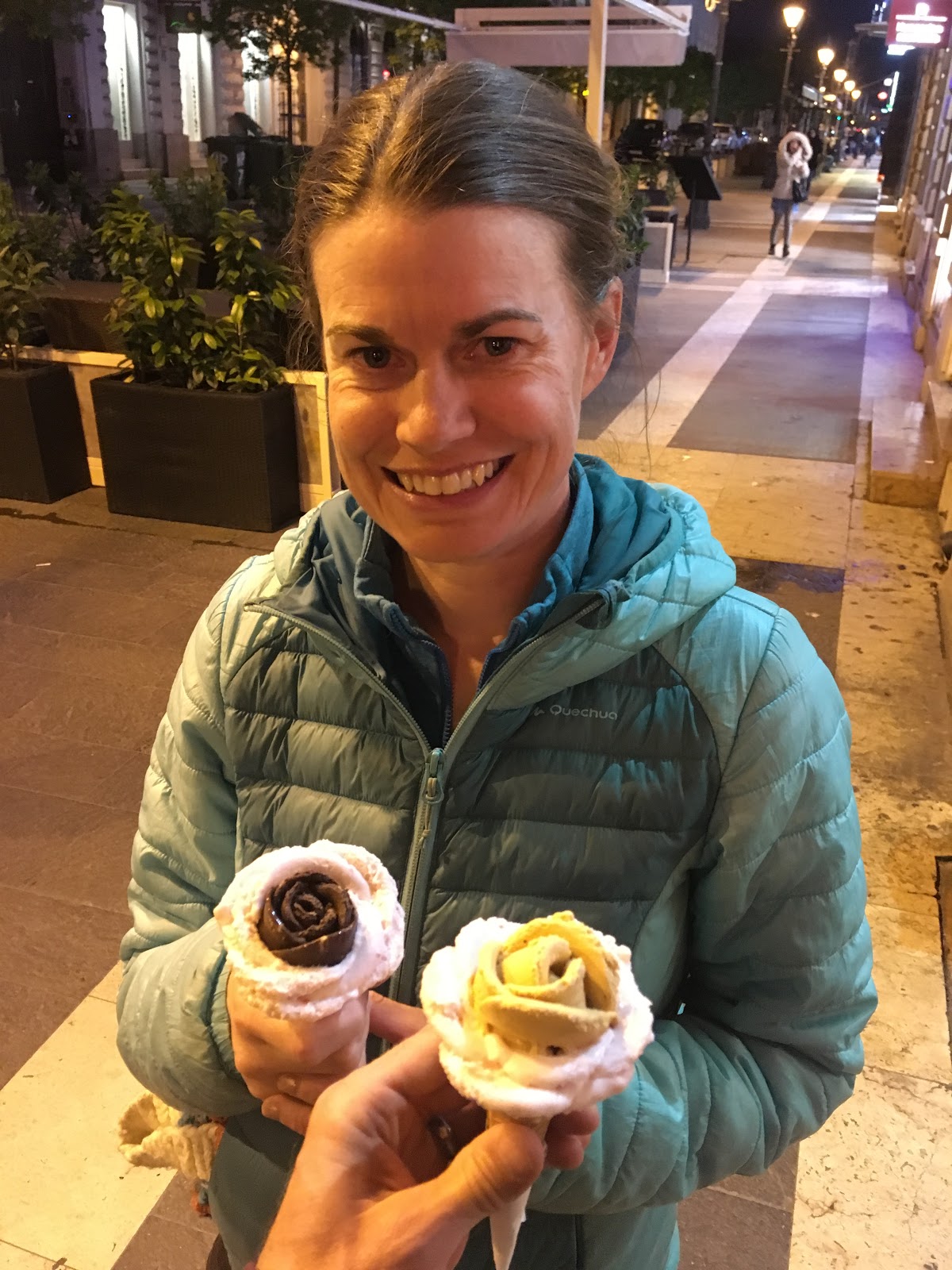 Pre-dinner drinks were taken at a Hungarian wine bar in the square, admiring the views. Then after some delicious food, we had ice creams for dessert, hand sculpted like roses while we walked the streets.