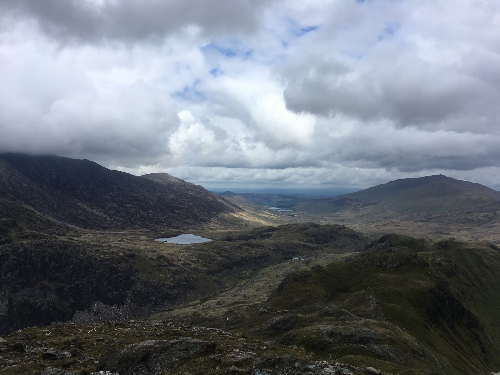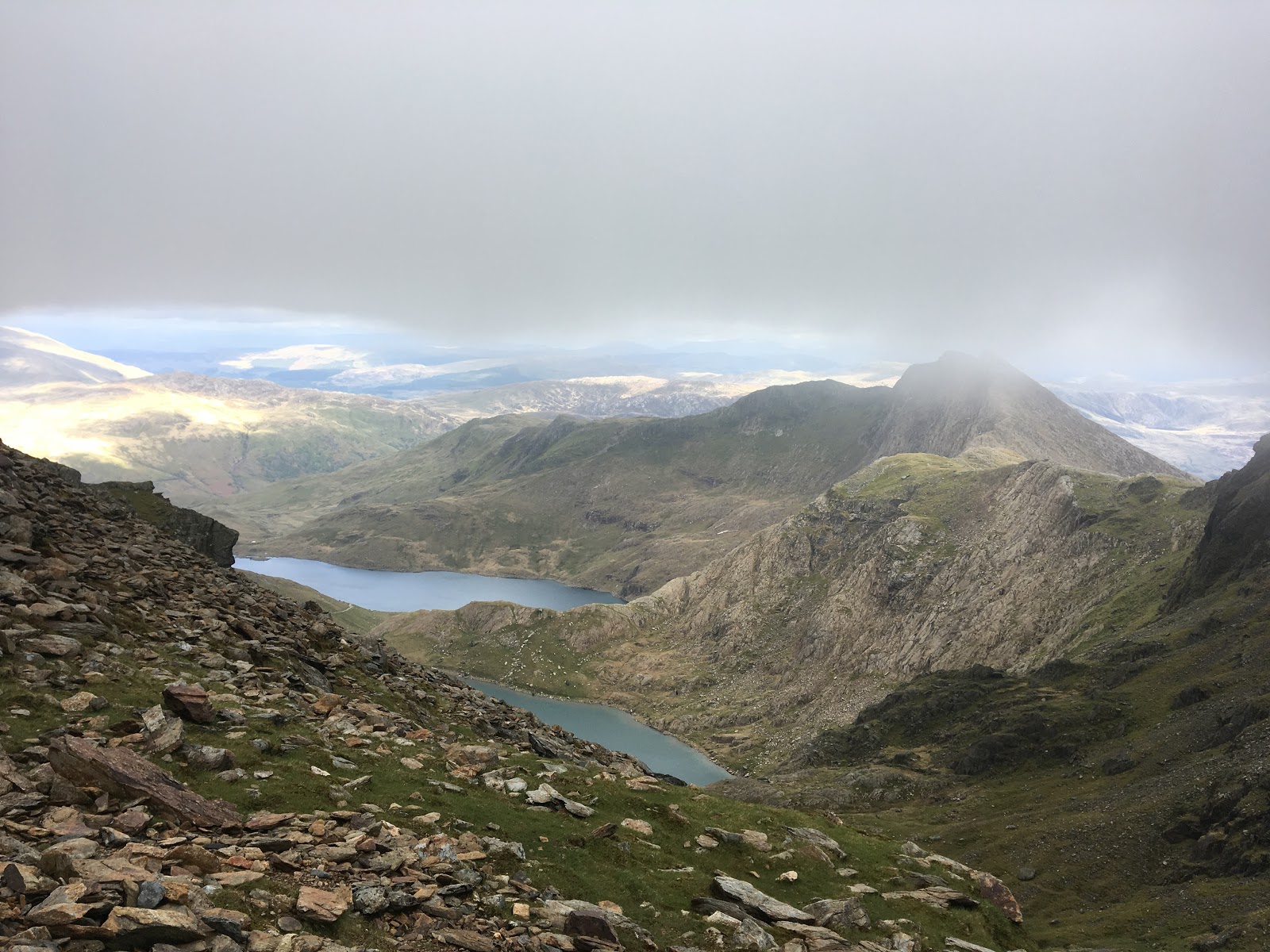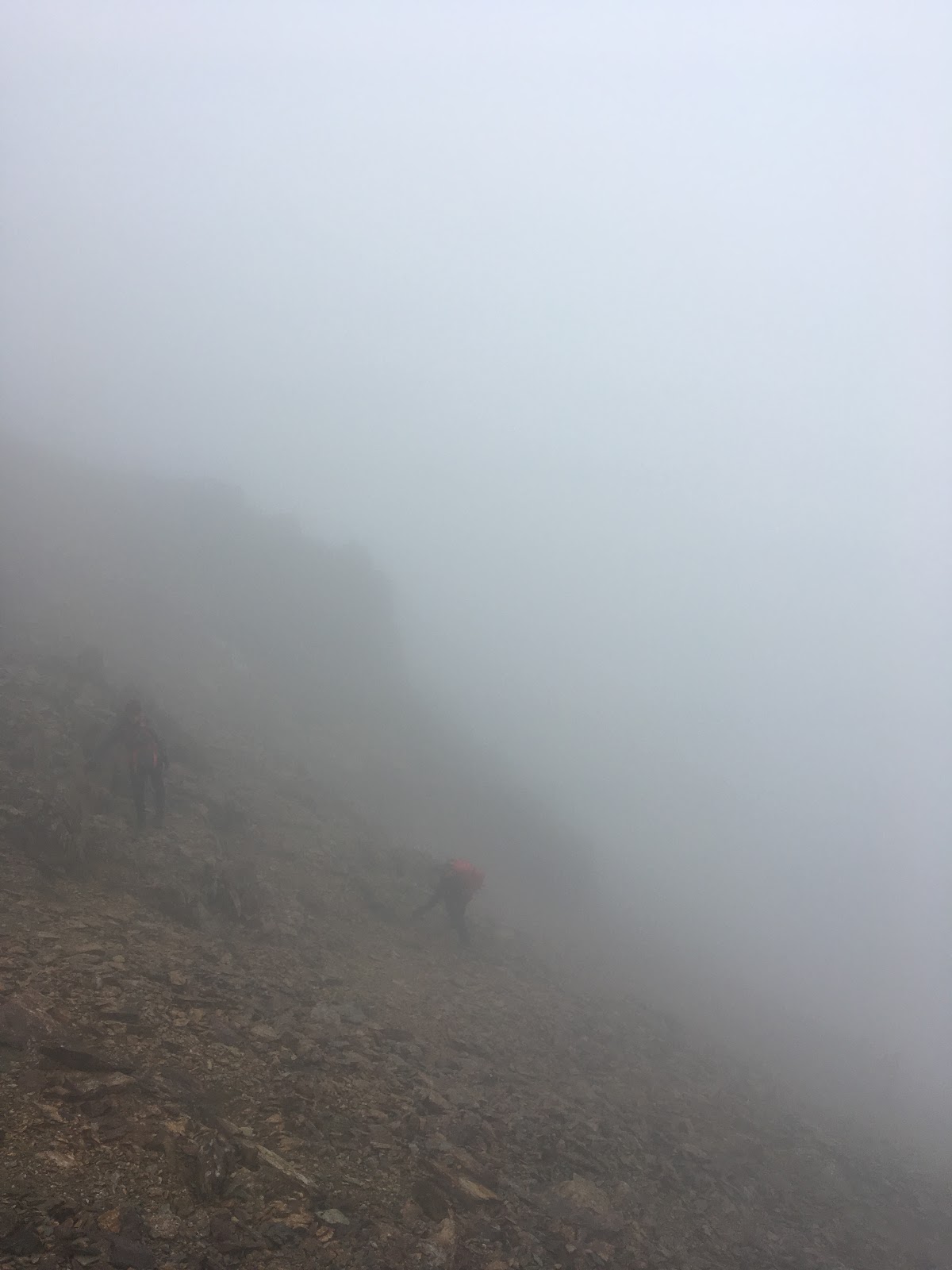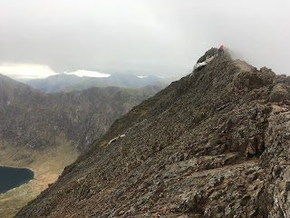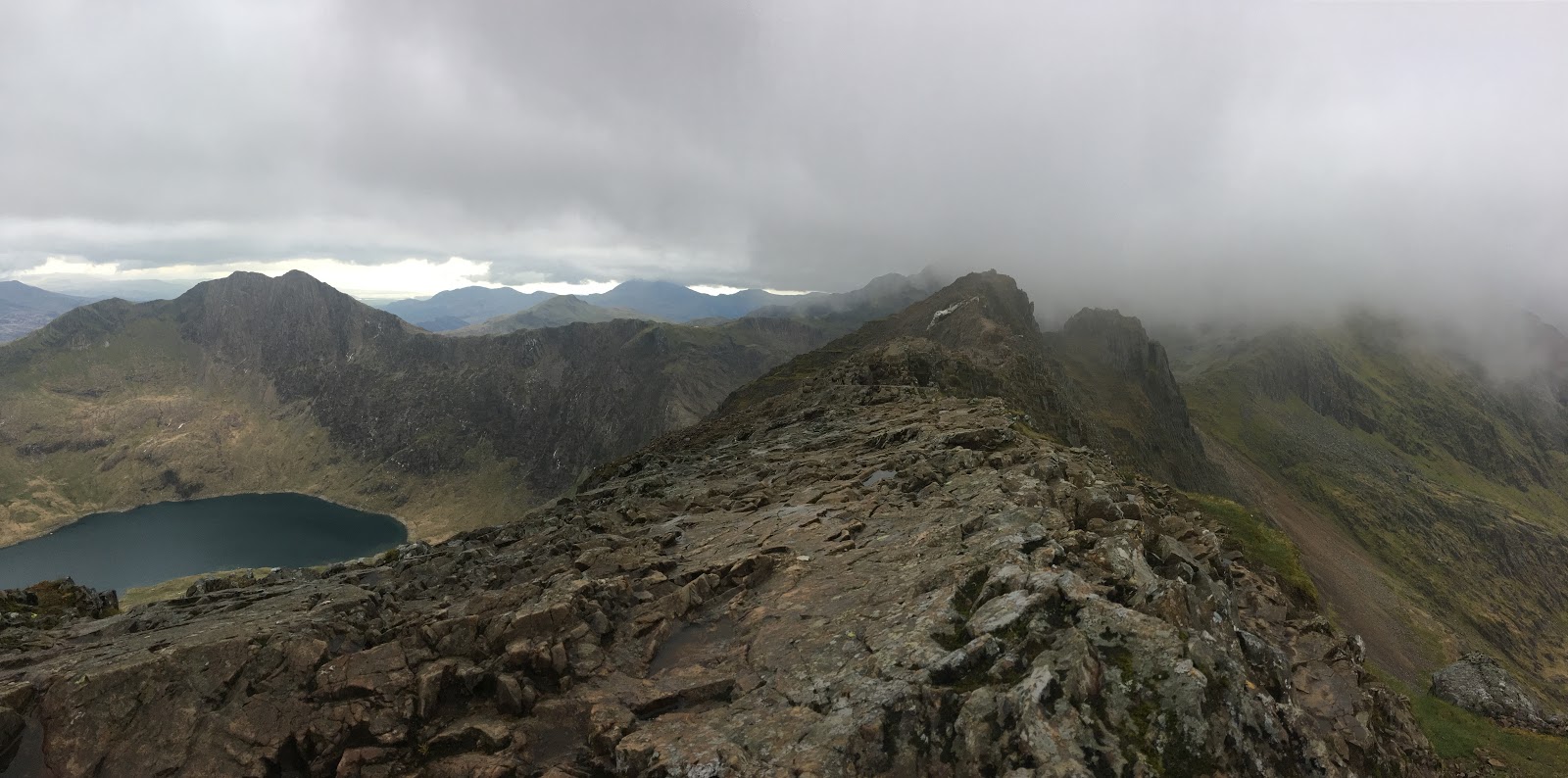 Near the end of the ridge, as my group began to tire, the cloud level dropped and took away the visibility, which added to the atmosphere and overall drama somewhat, but when we reached the fingerstone, we could see our way. At this point it was getting late, so we decided to not take in the summit of Snowdon, but instead, return to Pen y Pass, via the PyG track.