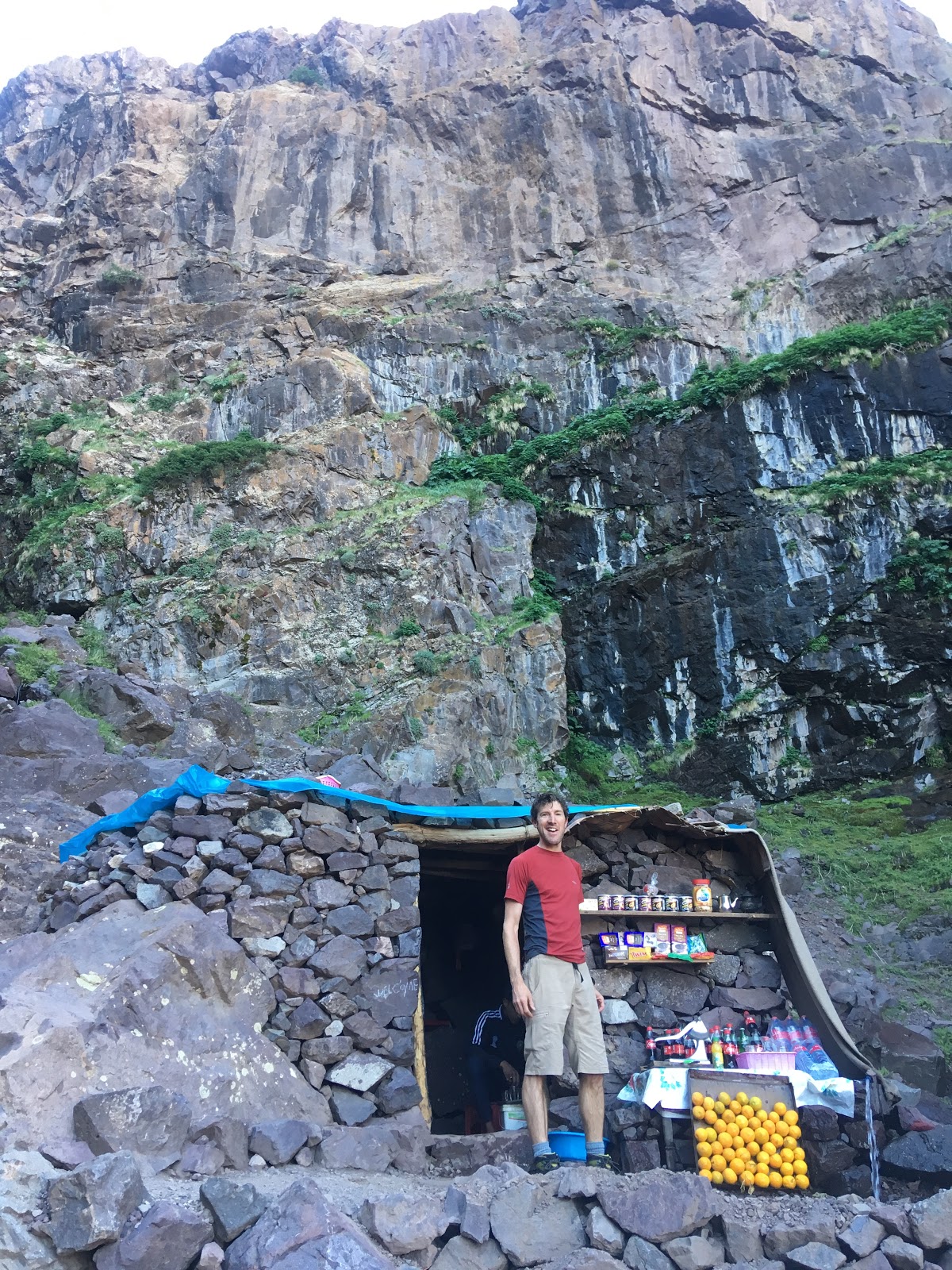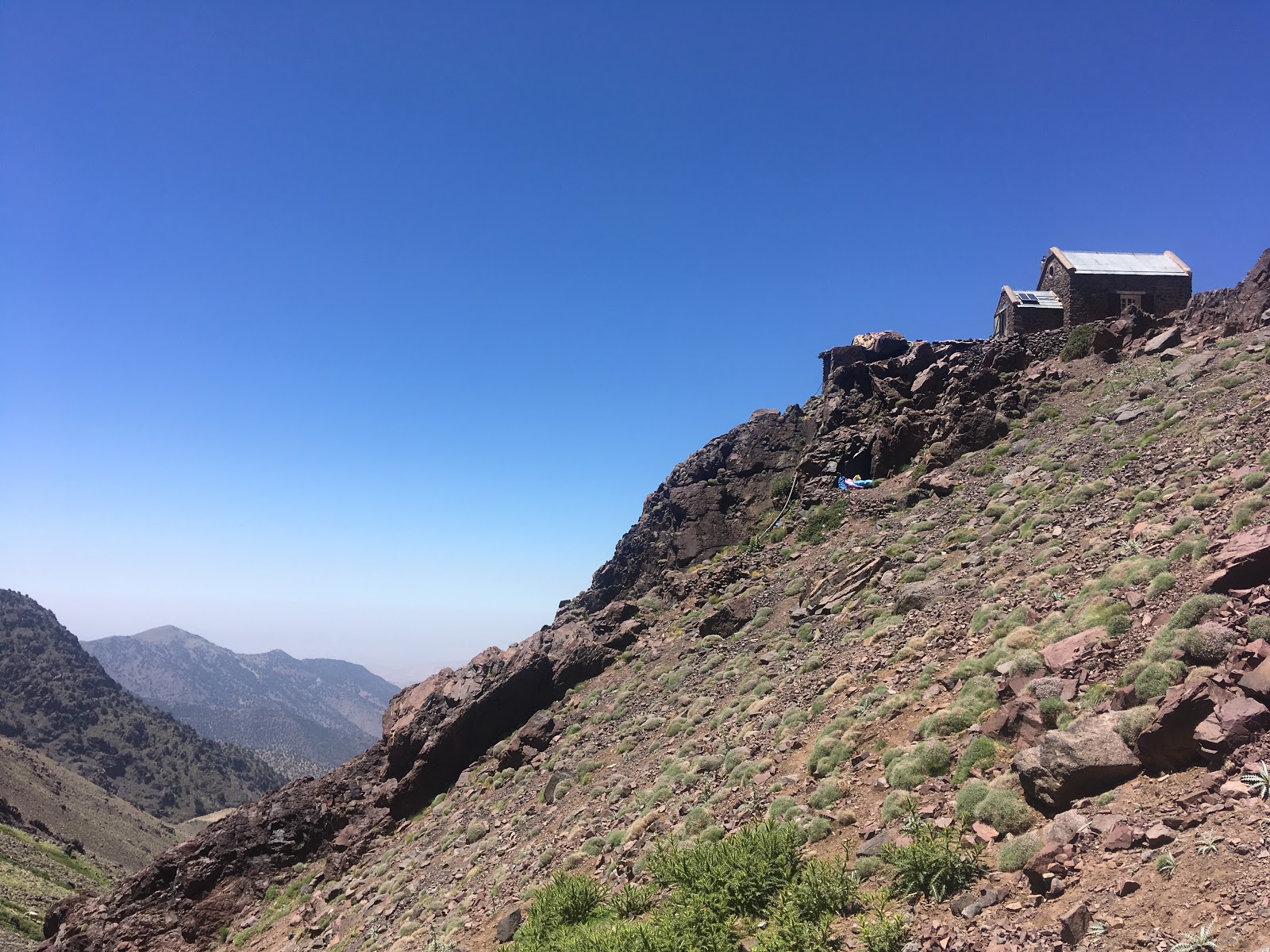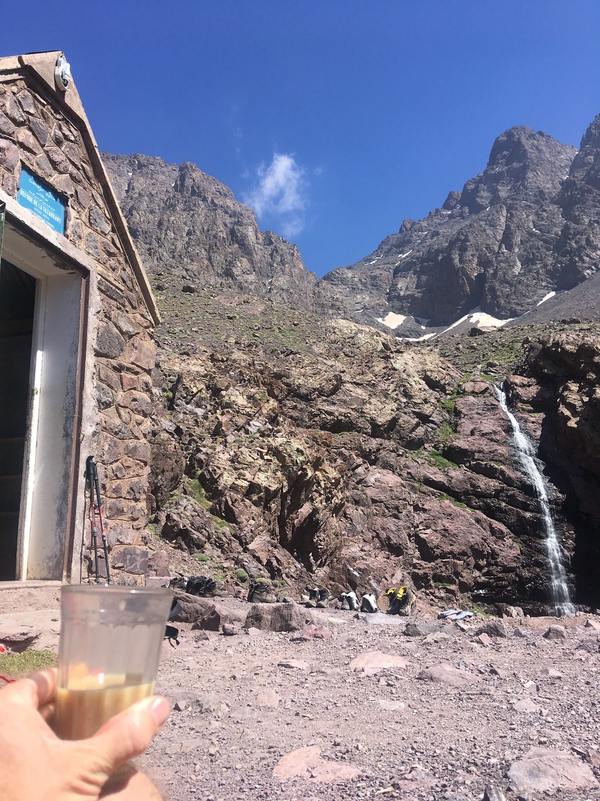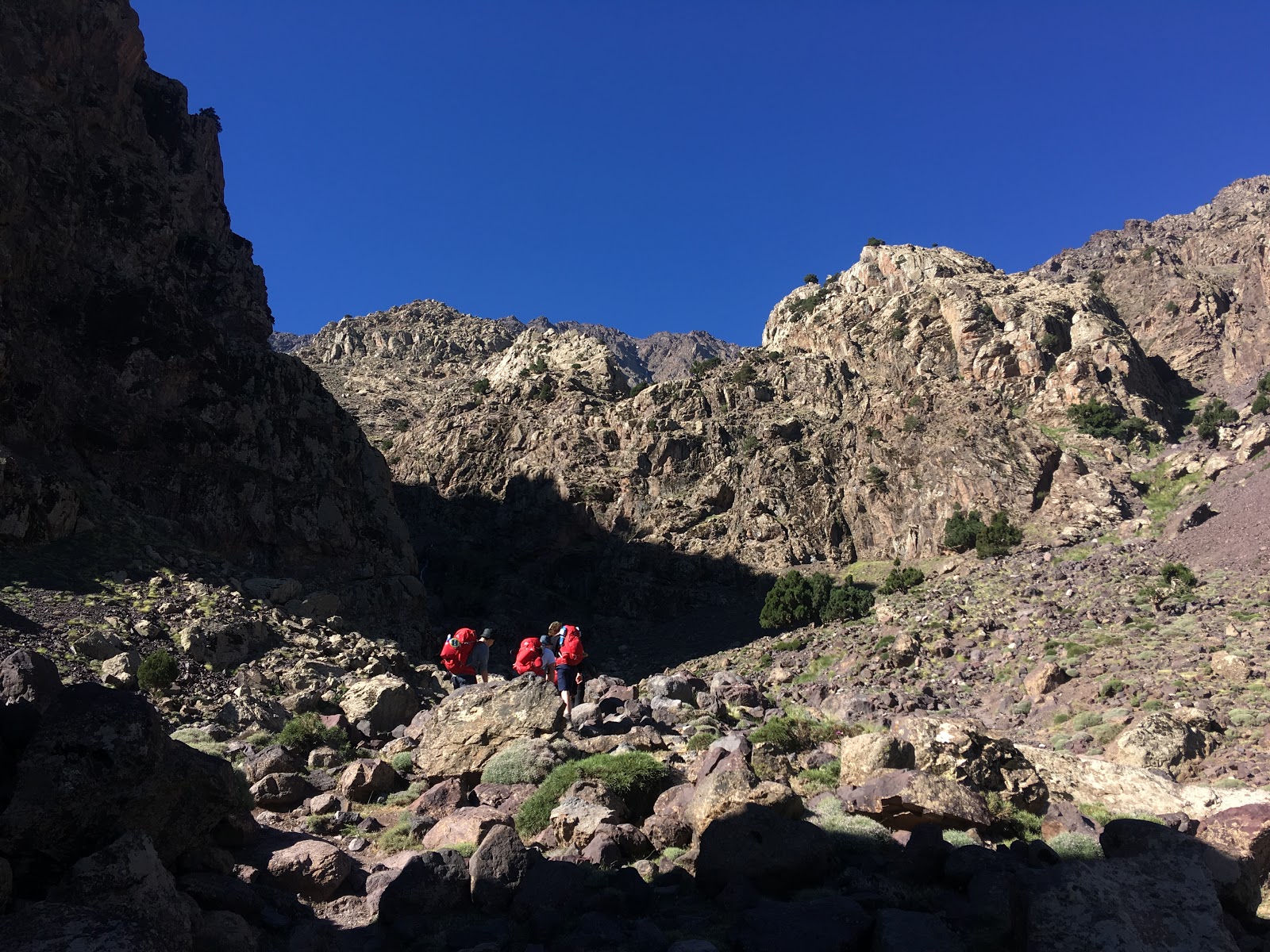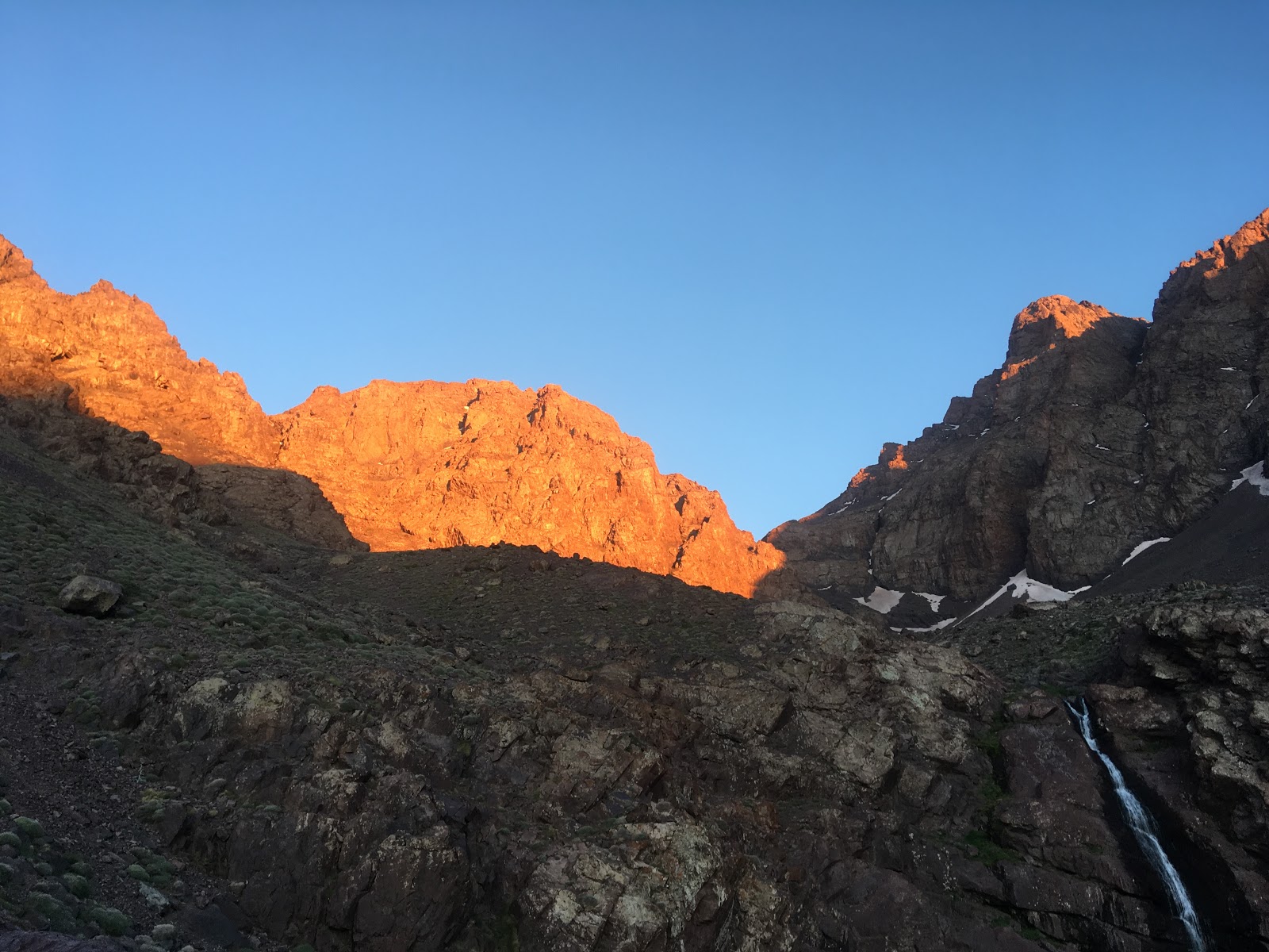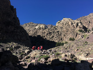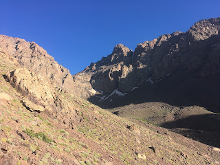 A lot of map and guidebook consulting followed as John and I tried to work out the best plans for tomorrow. I think we’ve convinced our local guide of a good plan. We’ll see how it pans out. We still have 1000m of height gain if we are going to summit one of the peaks around us. It’s amazingly remote in this valley. There are six other French mountaineers here, otherwise it’s just us. On the other side of the mountain, where Jebel Toubkal (the highest peak) is, I’m guessing that there are loads of trekkers. Because of this we are going to stay at this hut tomorrow night as well.
