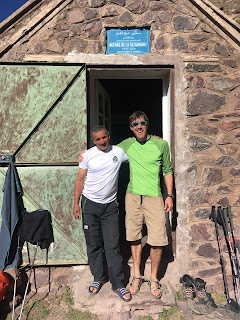 Hamed, our mule man, unable to bring his mules, had accompanied us to the Plateau with a rucksack full of food, and prepared a very nice picnic on the cliff edge, from where we could see the hut down below. After traversing along the edge of the plateau, I’d read that at the descent gully needed to be correctly identified as there were several and they are all steep!