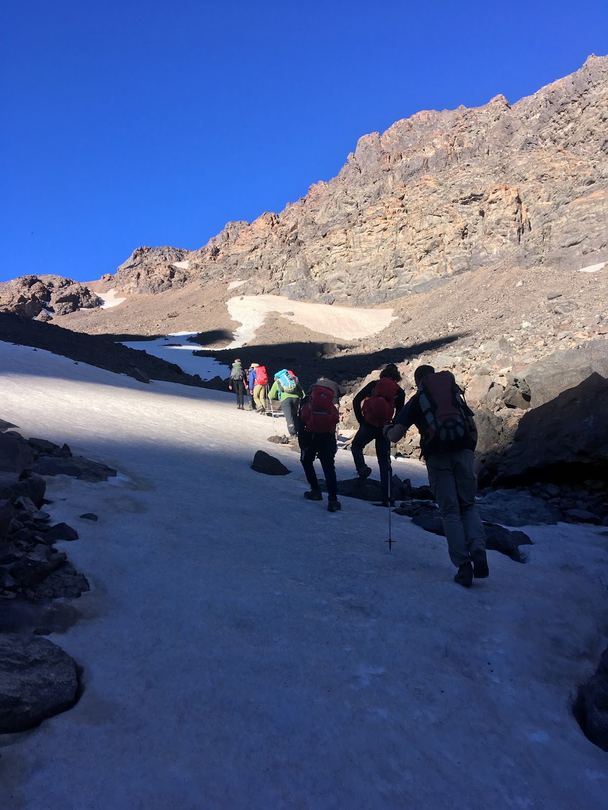 By 7am, we’d reached the first snow patch that we needed to cross. Back in the village, I’d been assured that there was no snow and no need for an ice axe. Against my better judgement, I’d left it behind, and now found myself wishing I’d still got it. It was only a short fully crossing, but a slip would have sent you a long way, with no chance of stopping. The snow was rock hard, so we laboriously kicked some shallow steps, and carefully spotted everyone across. It worked, but would have been a lot less stressful with an axe!